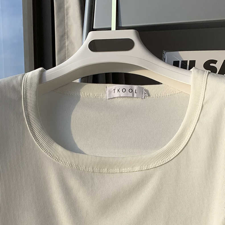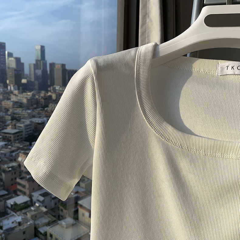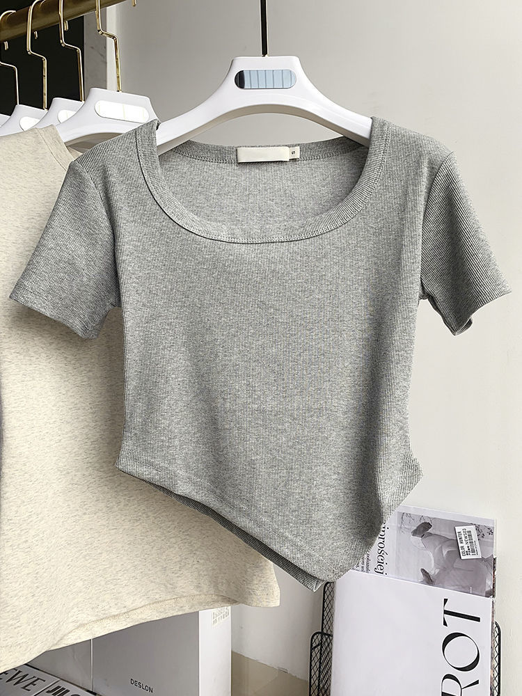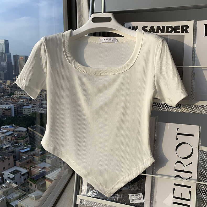 正肩螺纹不规则方领t恤女短袖夏季新款修身短款u领设计感小众上衣