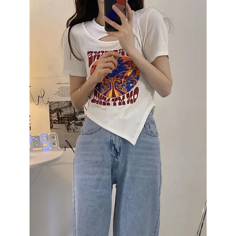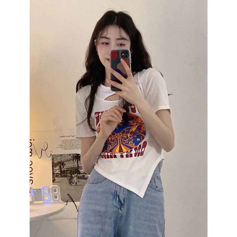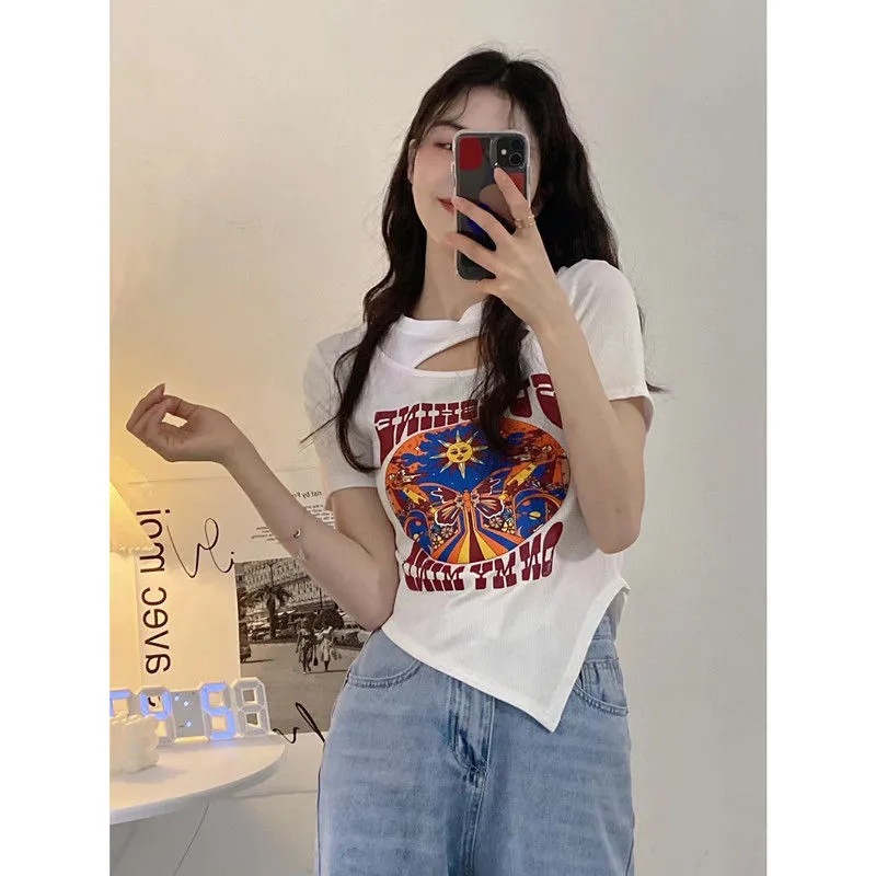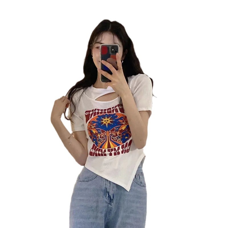 夏季新款韩版甜酷独特上衣小众不规则下摆印花短袖T恤女ins潮