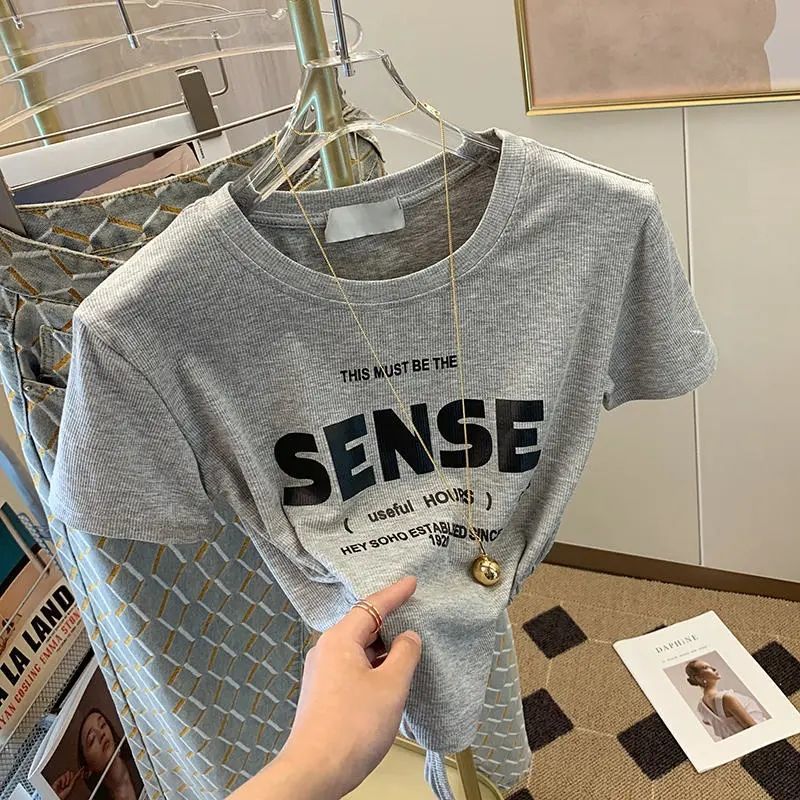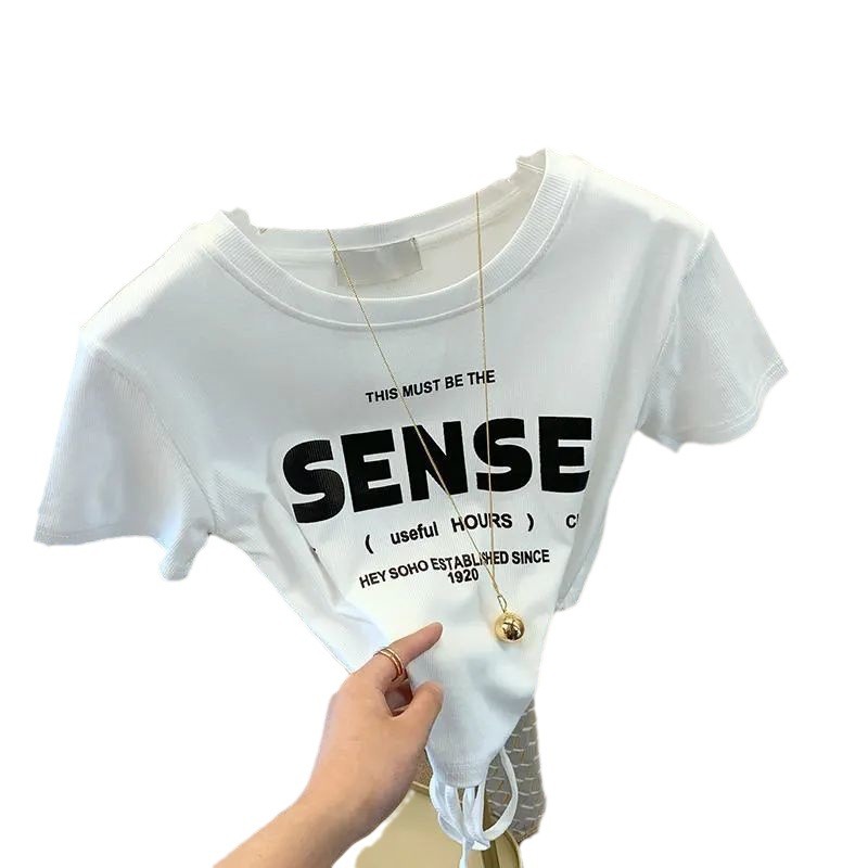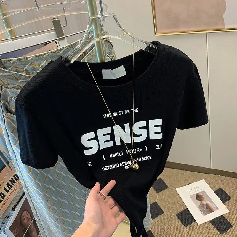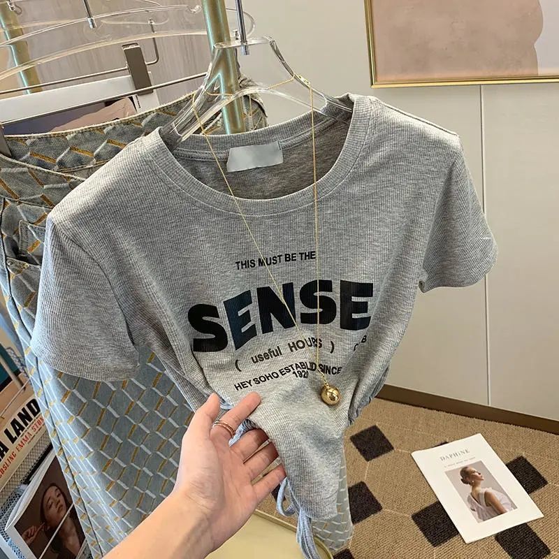 设计感时尚字母印花短袖t恤女夏新款独特别致绑带小众上衣ins