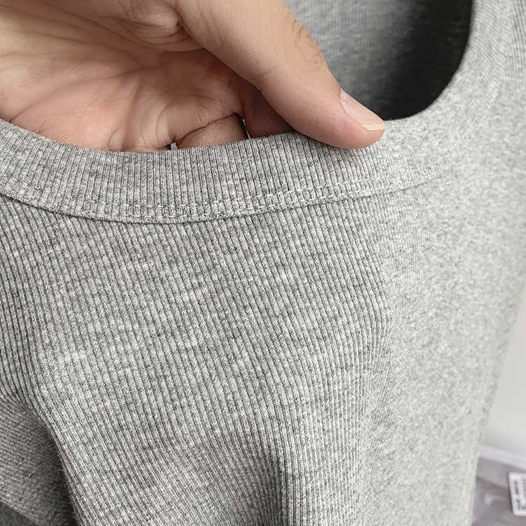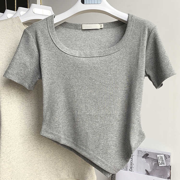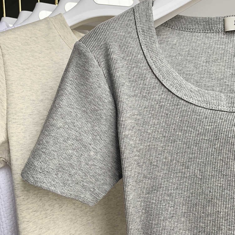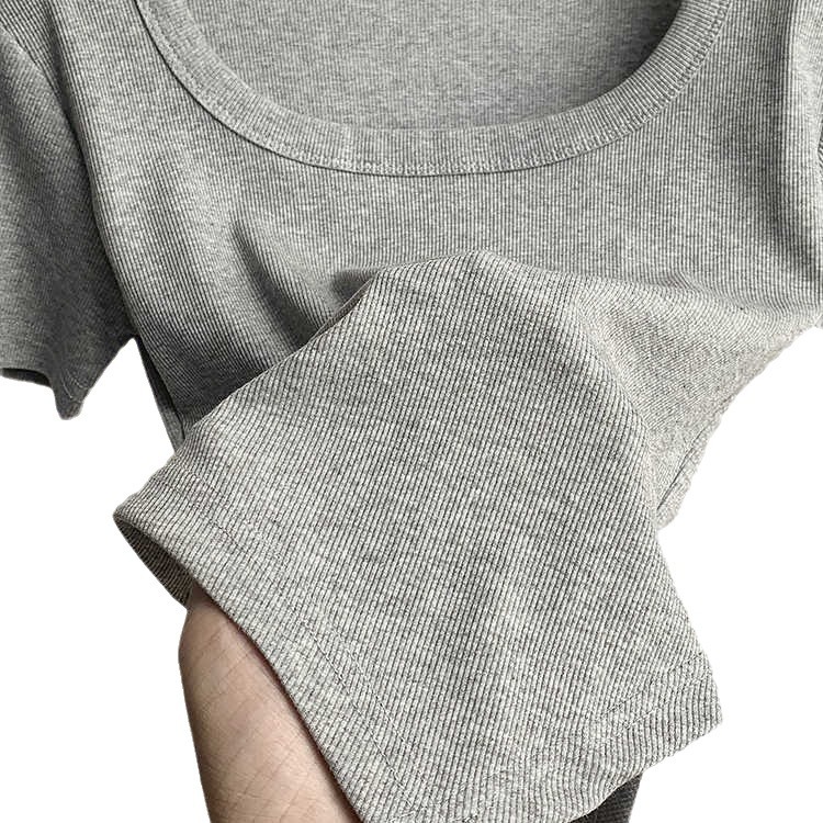 下摆不规则螺纹方领t恤女夏季新款修身短款u领设计感短袖上衣
