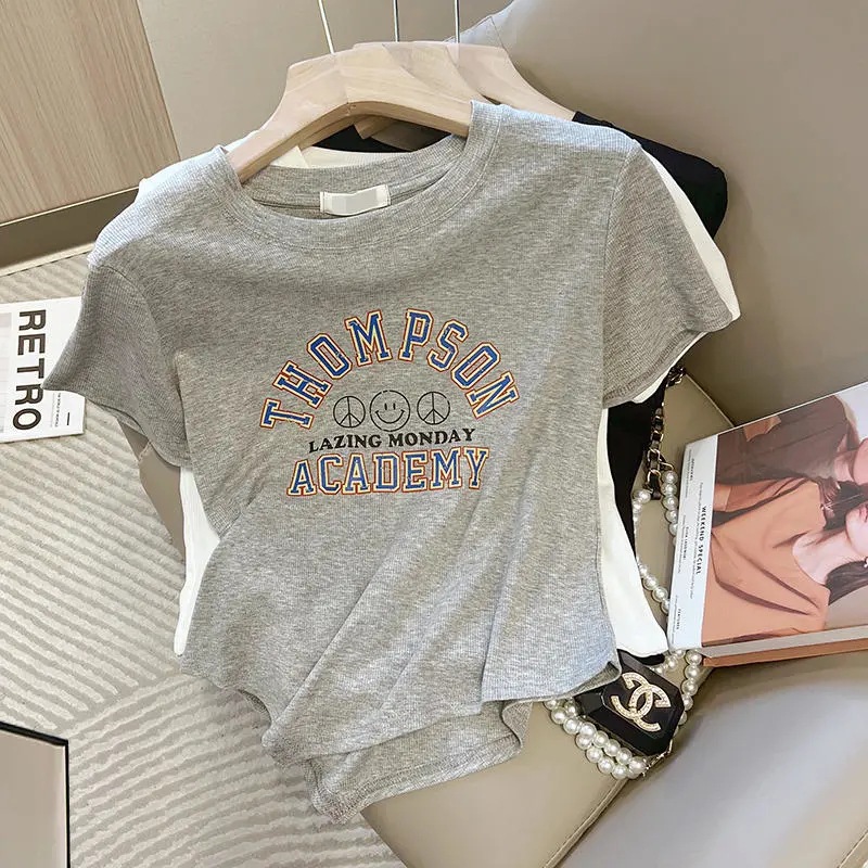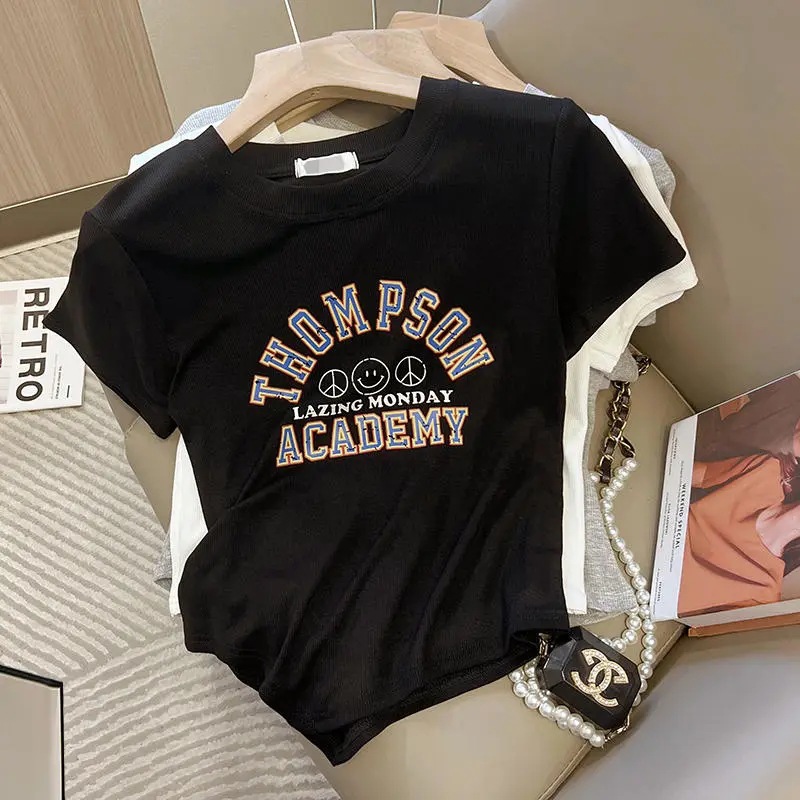 韩版圆领字母印花小众设计感不规则短袖T恤女夏新款别致上衣