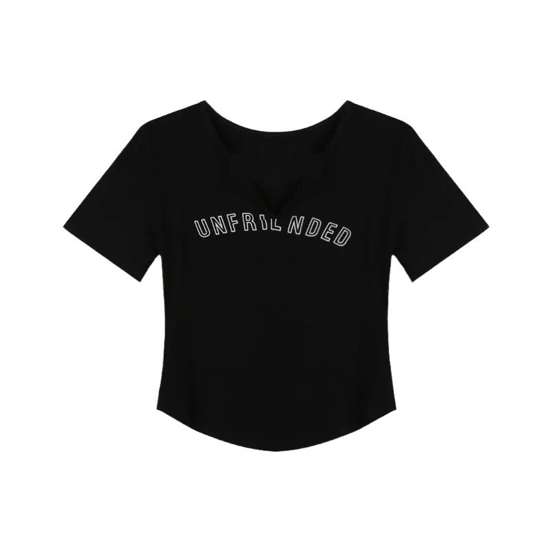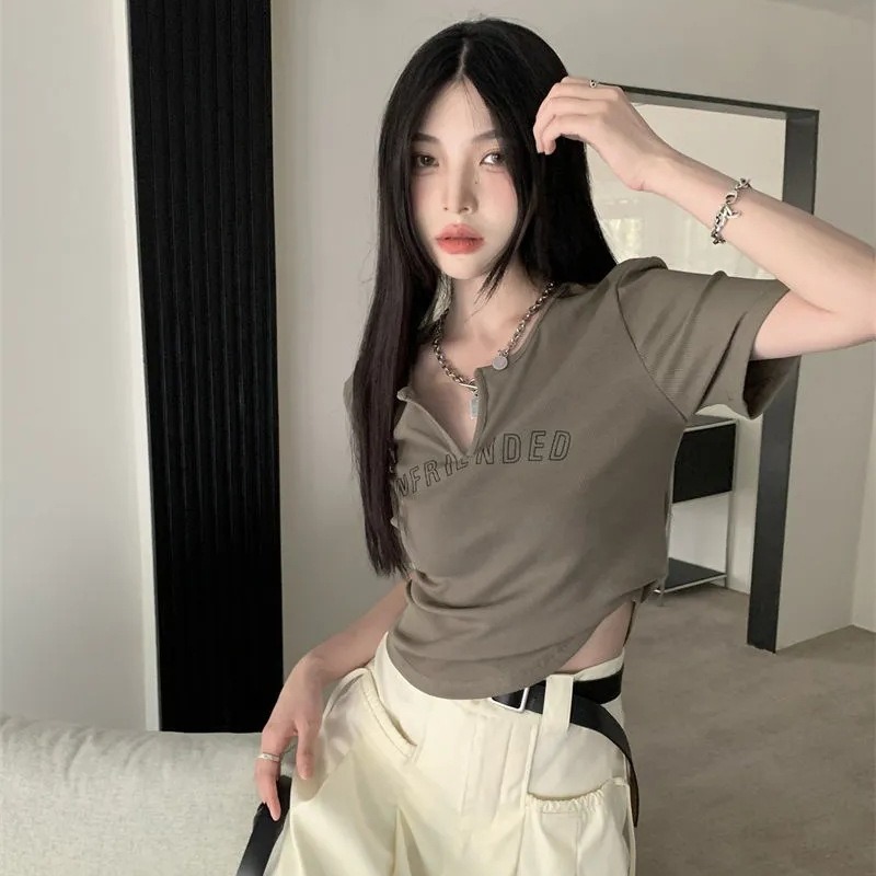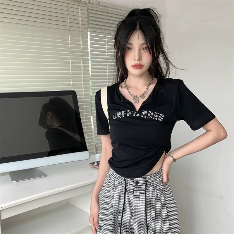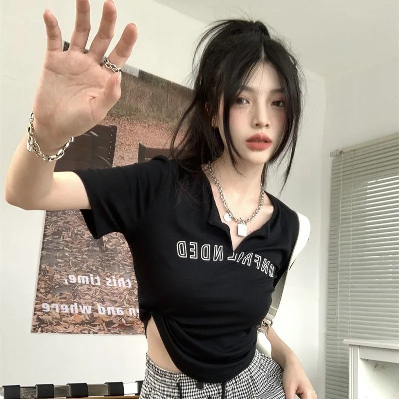 设计感不规则短袖T恤女夏季复古显瘦V领修身辣妹字母正肩短款上衣