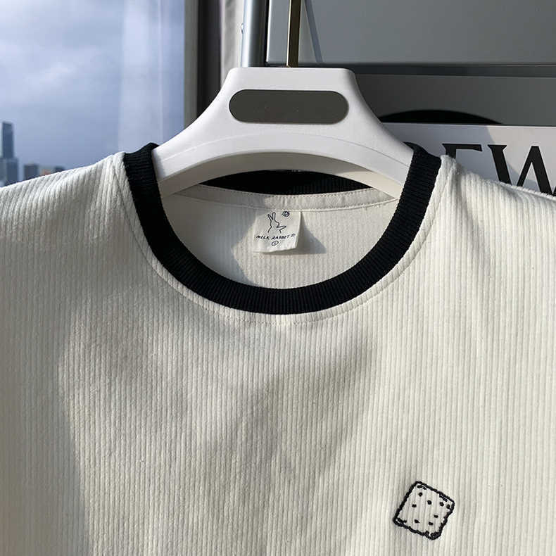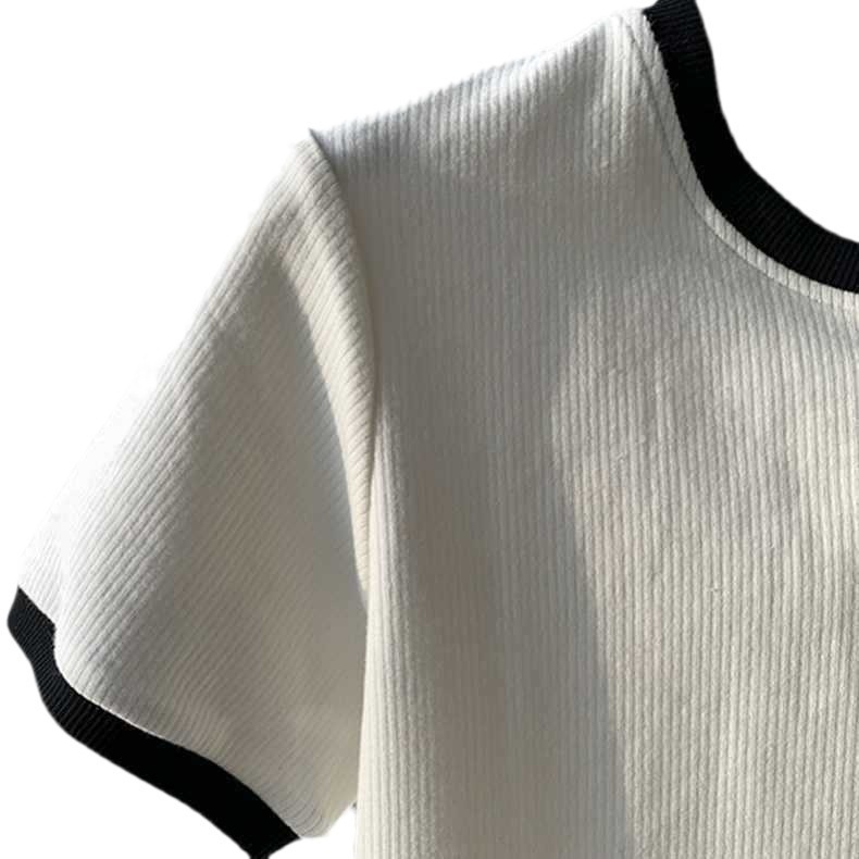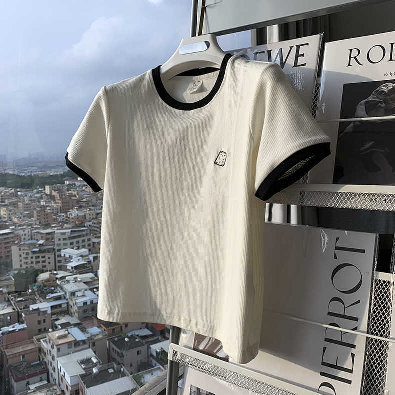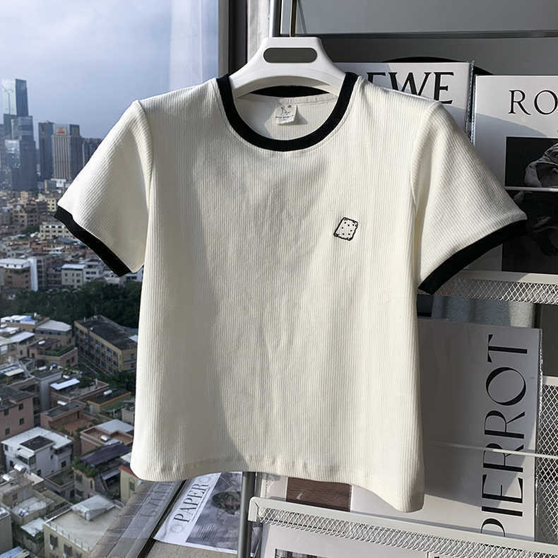 新款撞色边小饼干刺绣坑条T恤正肩短款小宽松短袖女上衣夏季