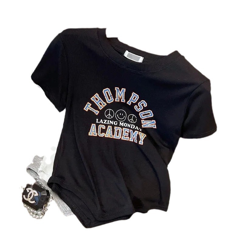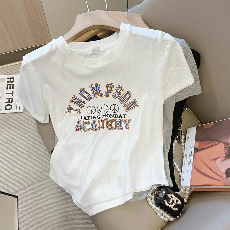 韩版圆领字母印花小众设计感不规则短袖T恤女夏新款别致上衣