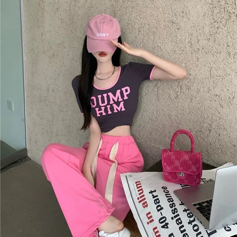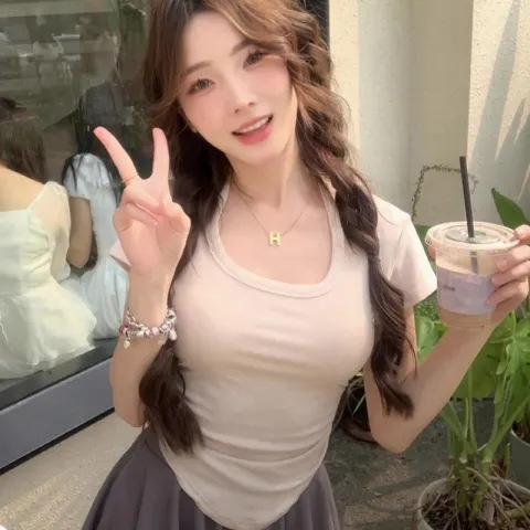 港味露锁骨撞色U领短袖T恤女夏季新款韩版百搭显瘦打底上衣