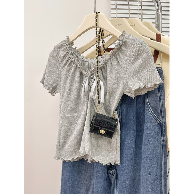 法式V领短袖T恤女夏季短款修身显瘦设计感小众抽绳半袖纯欲风上衣