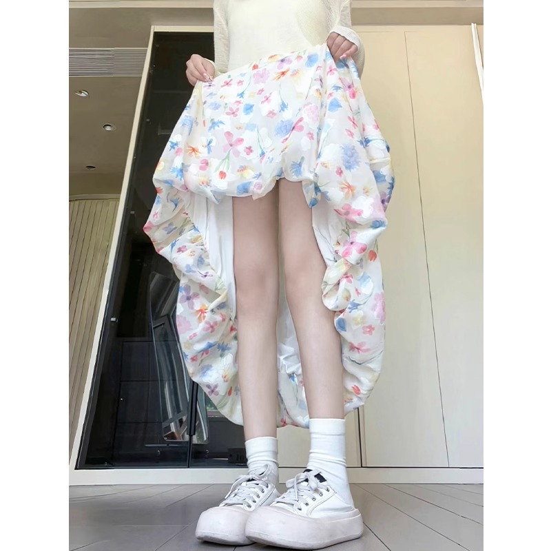 彩色花苞半身裙女夏季薄款2025新款设计感韩系复古碎花冰丝灯笼裙