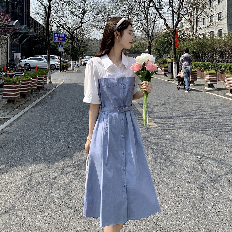 撞色衬衫连衣裙夏季新款气质小个子显瘦收腰法式拼接A字裙子