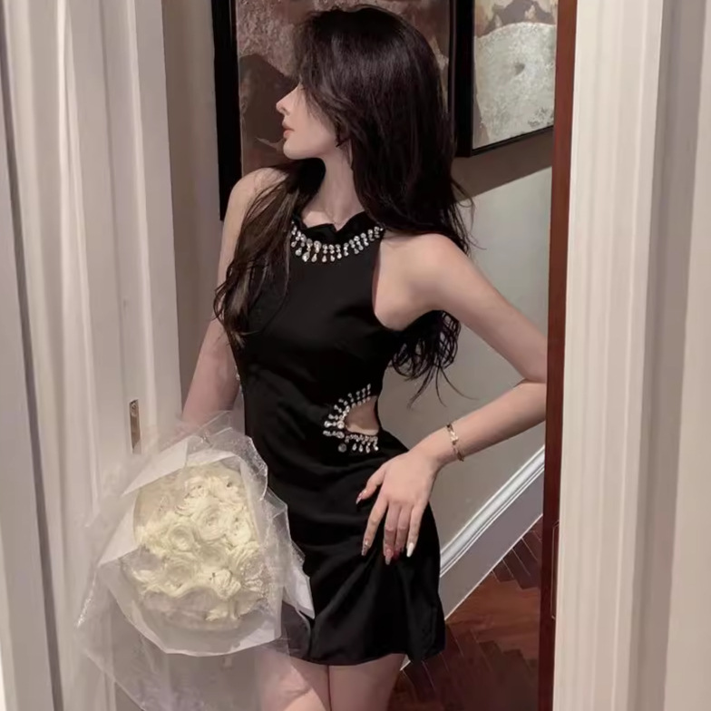 名媛风钉钻露腰挂脖无袖连衣裙重工修身生日聚会小黑裙礼服