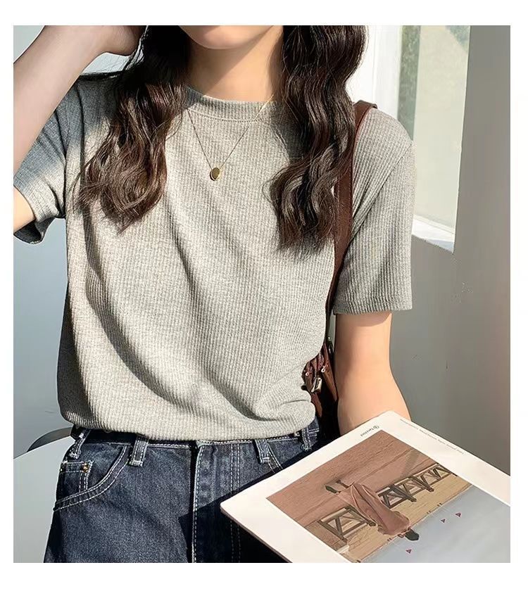 螺纹灰色显瘦短袖t恤女夏季上衣新款修身半袖圆领打底衫