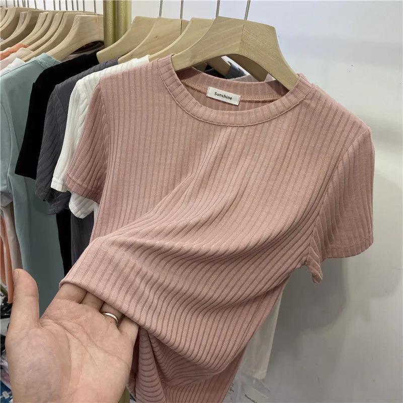 欧货坑条圆领短袖T恤上衣女春夏新款韩版显瘦内搭打底衫ins潮