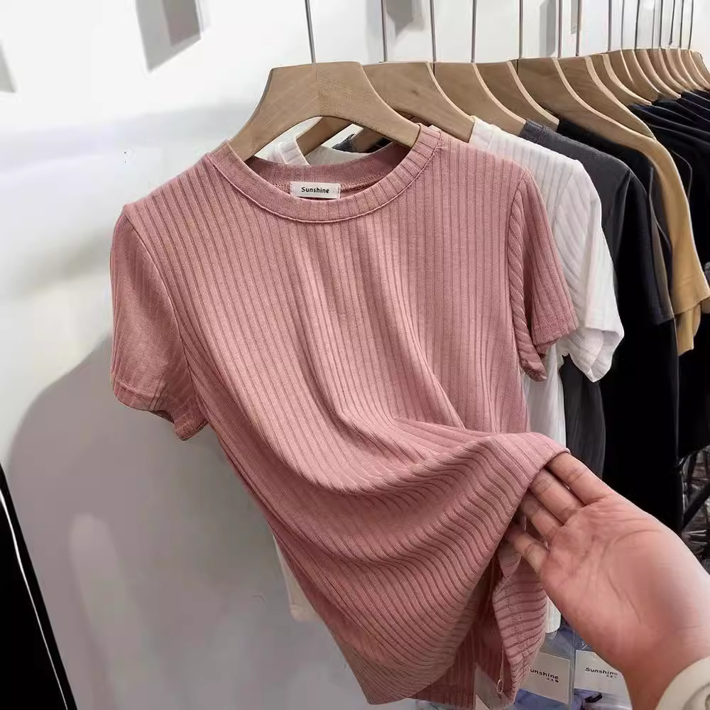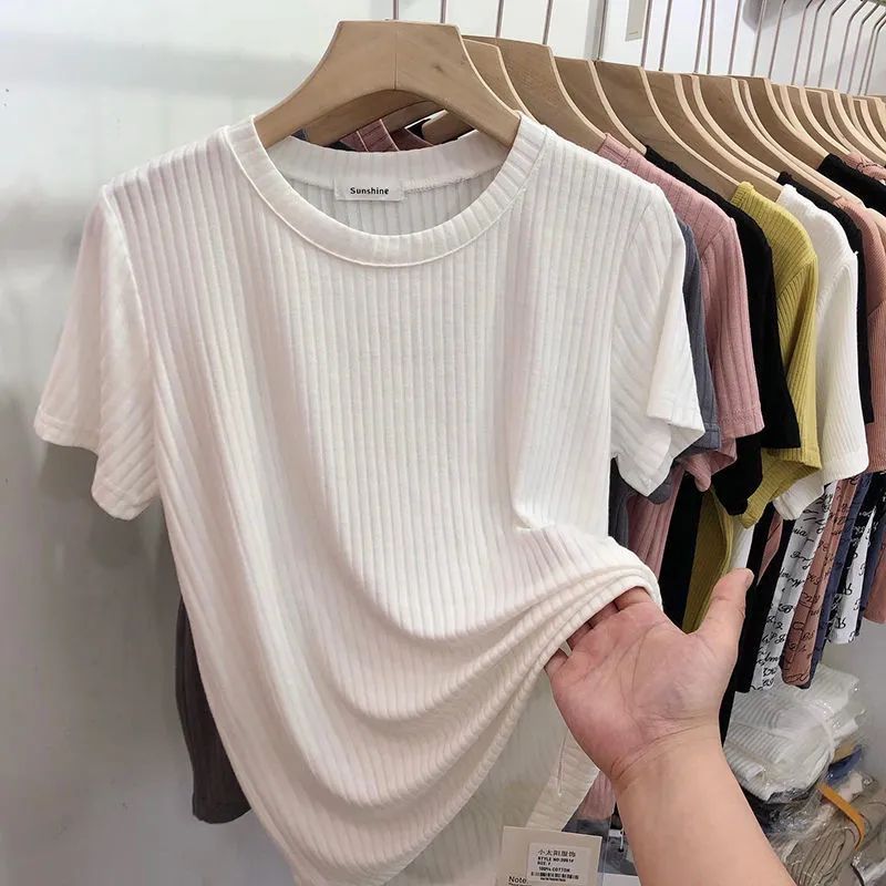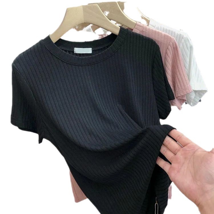 欧货螺纹坑条纯色t恤修身短袖女夏季年新款百搭体恤上衣ins潮