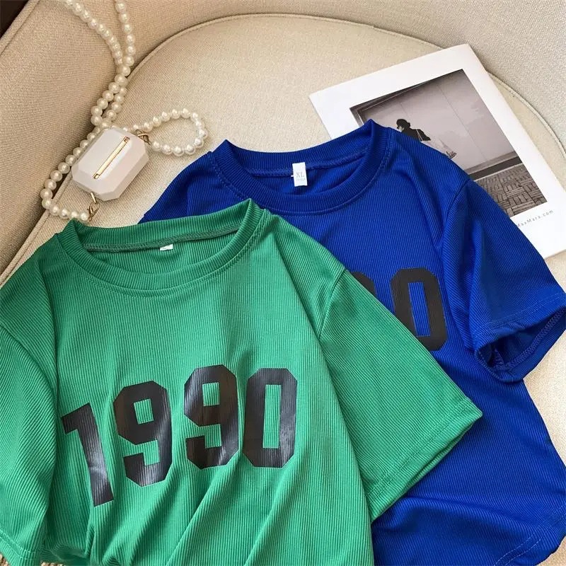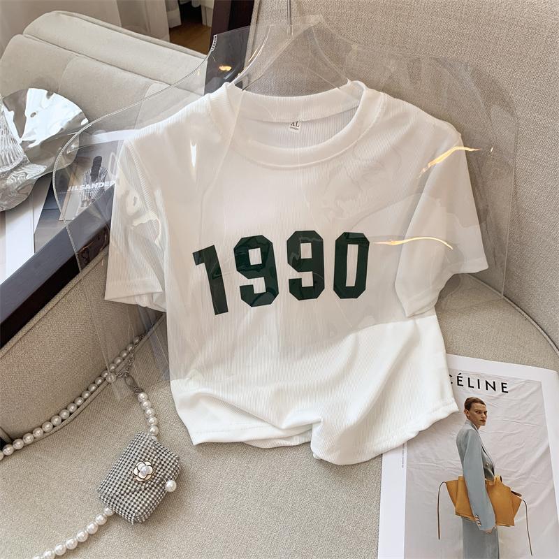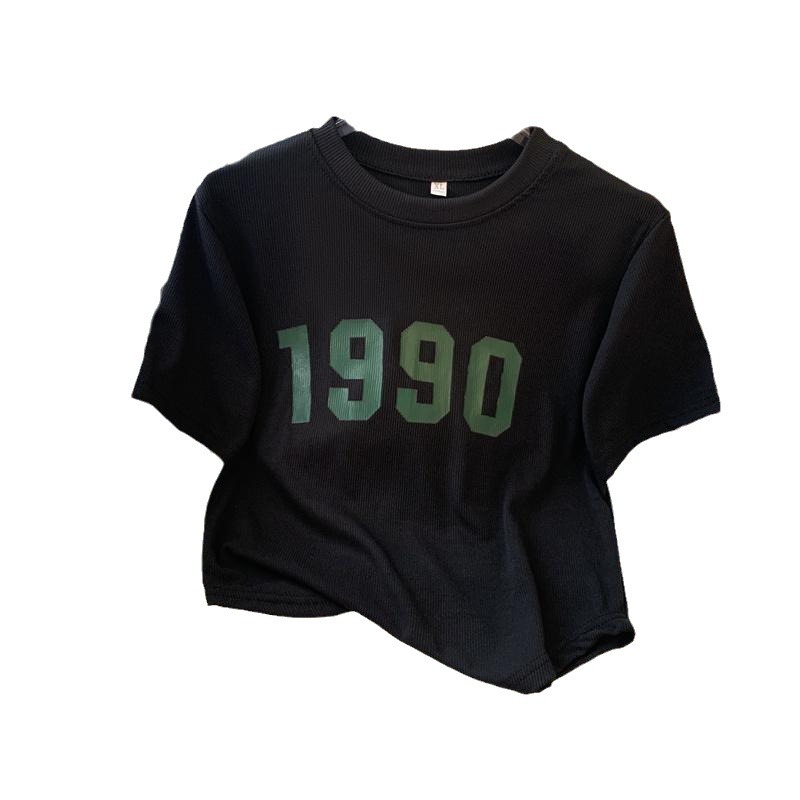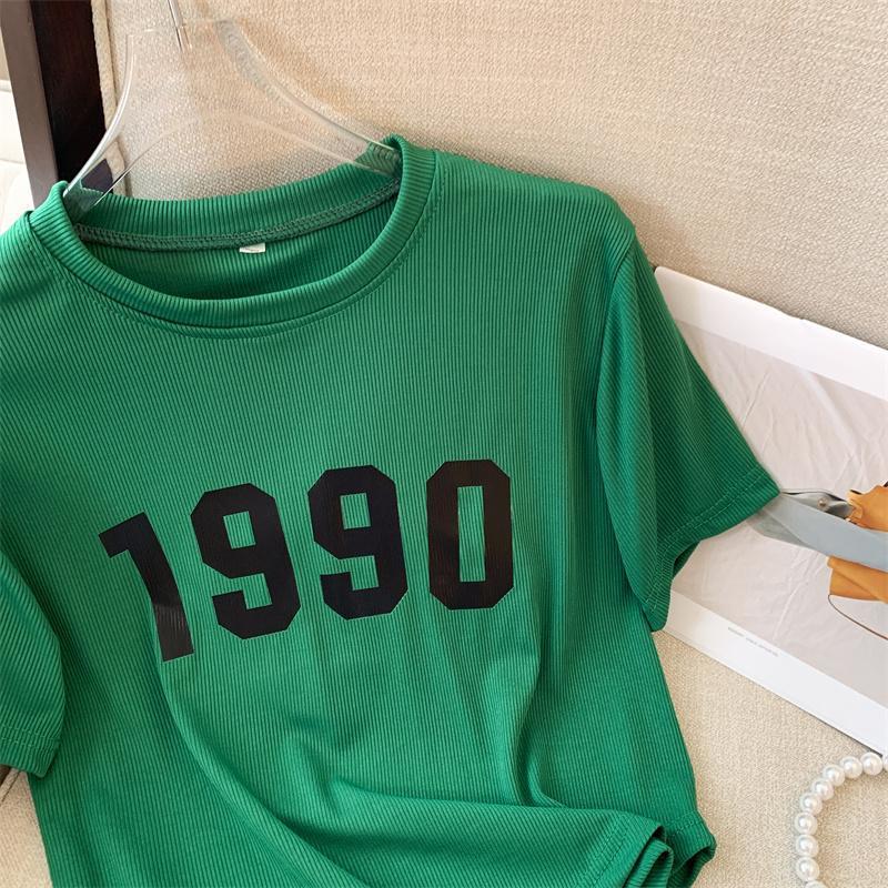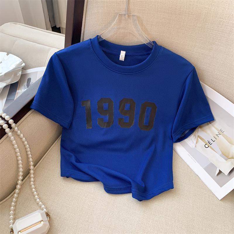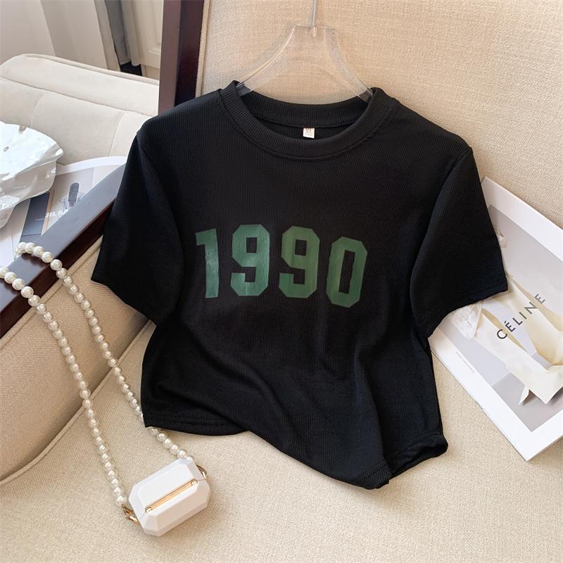 设计感chic短袖T恤女夏季圆领印花打底衫修身短款螺纹别致上衣潮