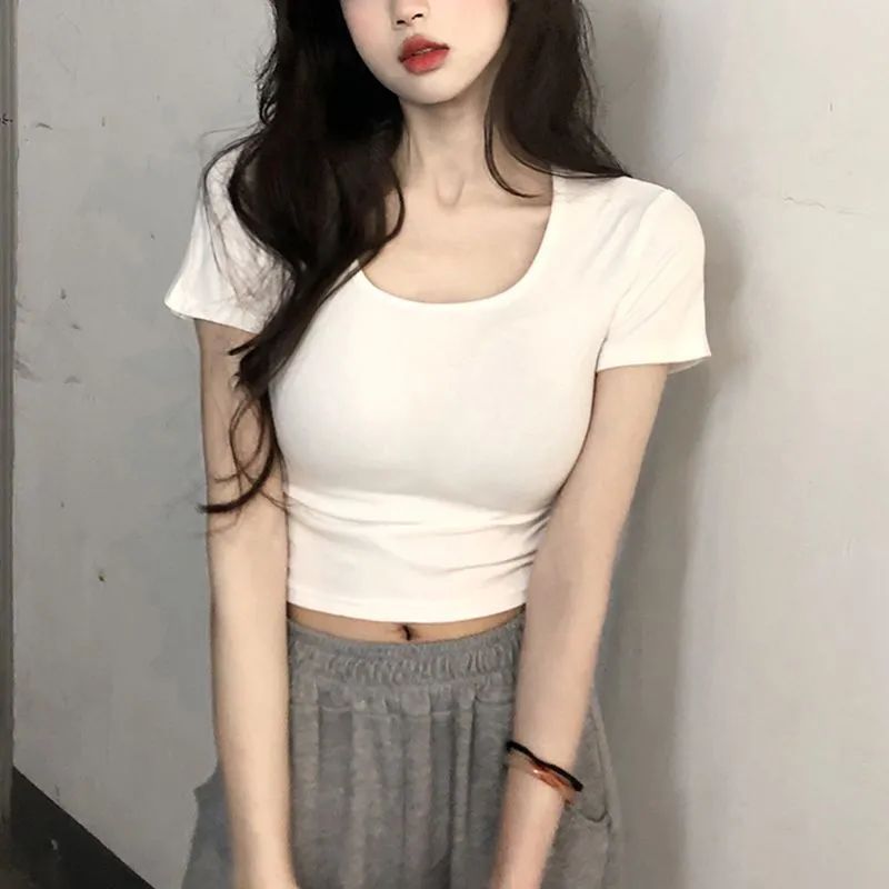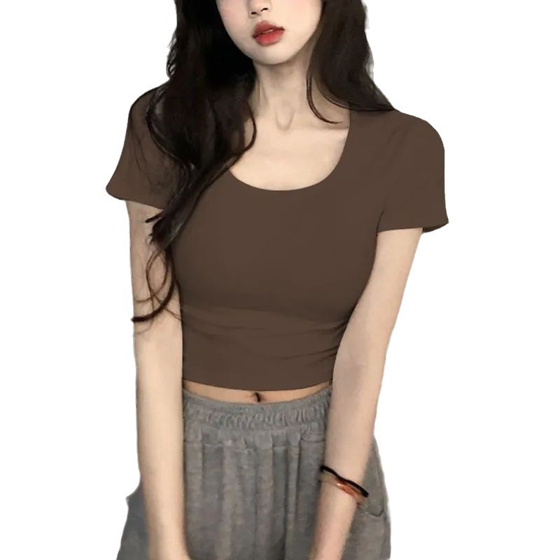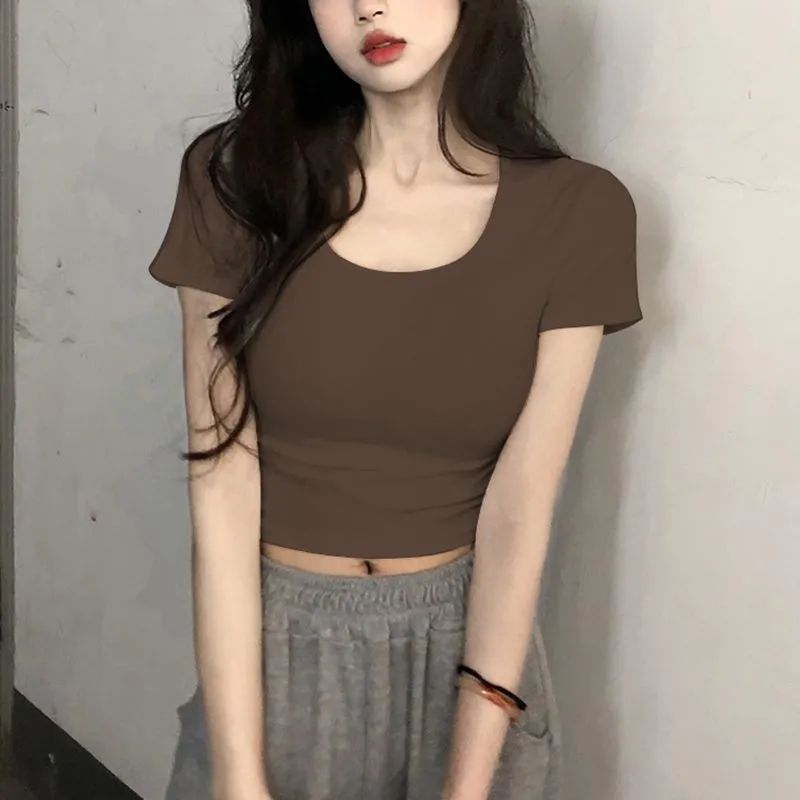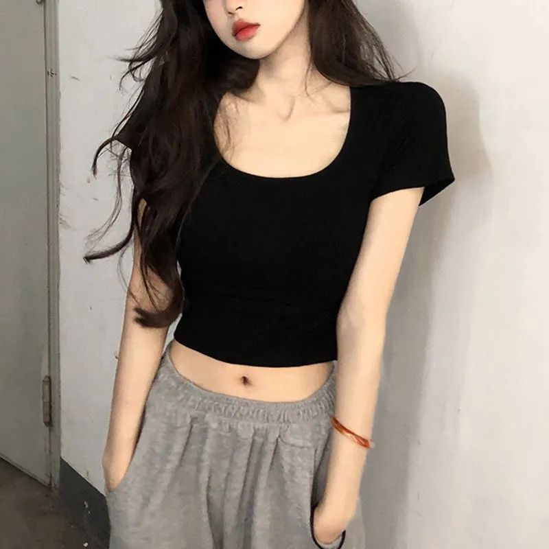黑色短袖t恤女夏季新款修身正肩纯欲显身材高腰辣妹短上衣服