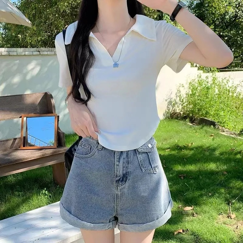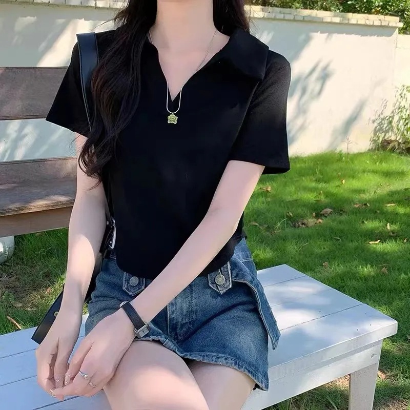 白色不规则polo领短袖t恤女夏季设计感小众修身短款正肩上衣