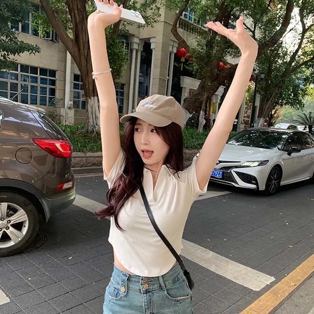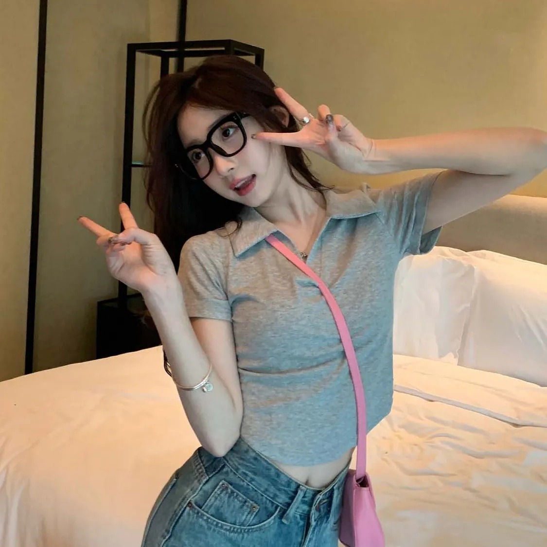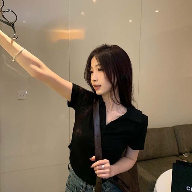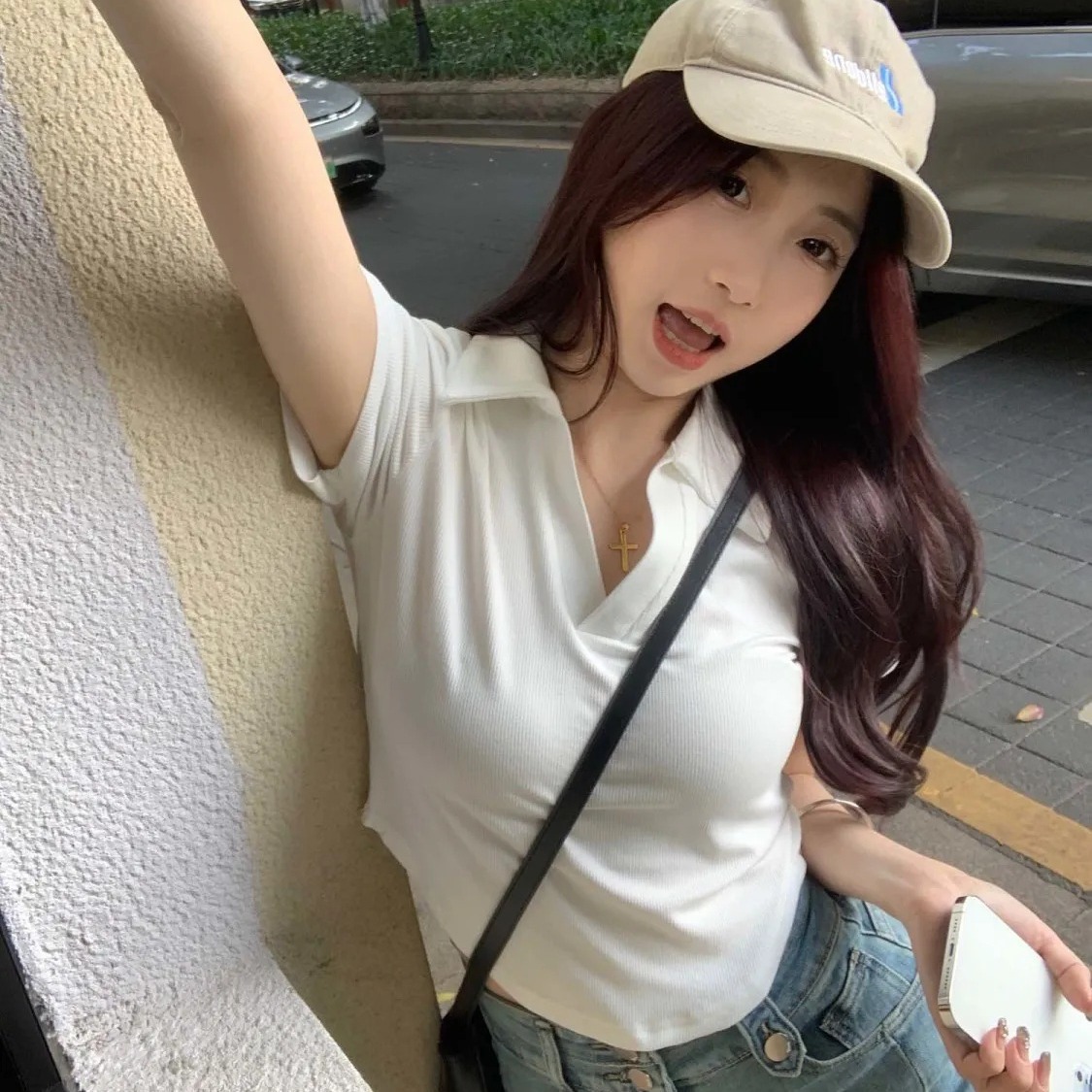 不规则V领正肩短袖女夏季新款百搭辣妹修身显瘦Polo衫T恤上衣