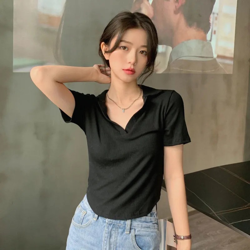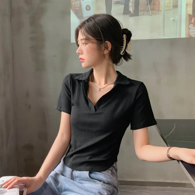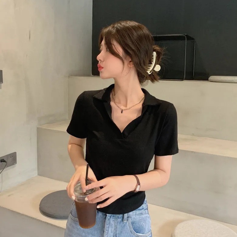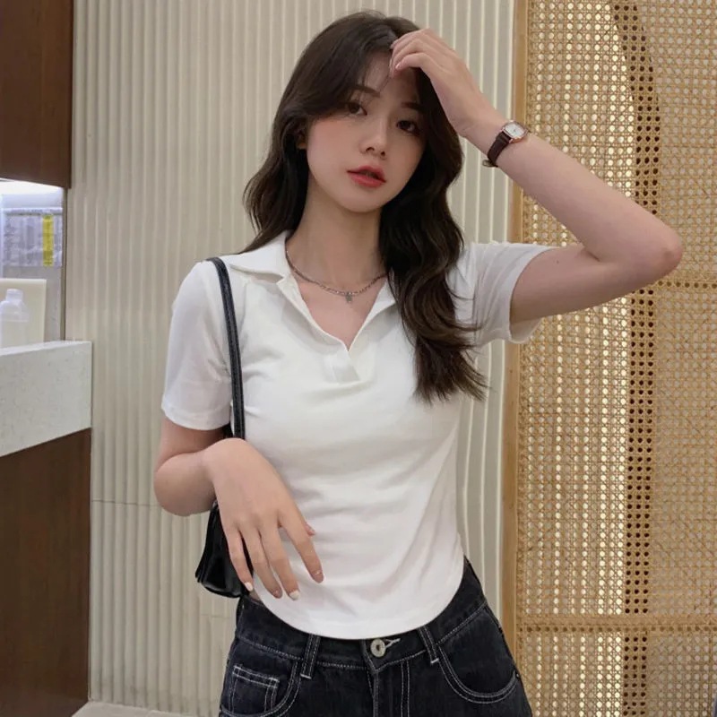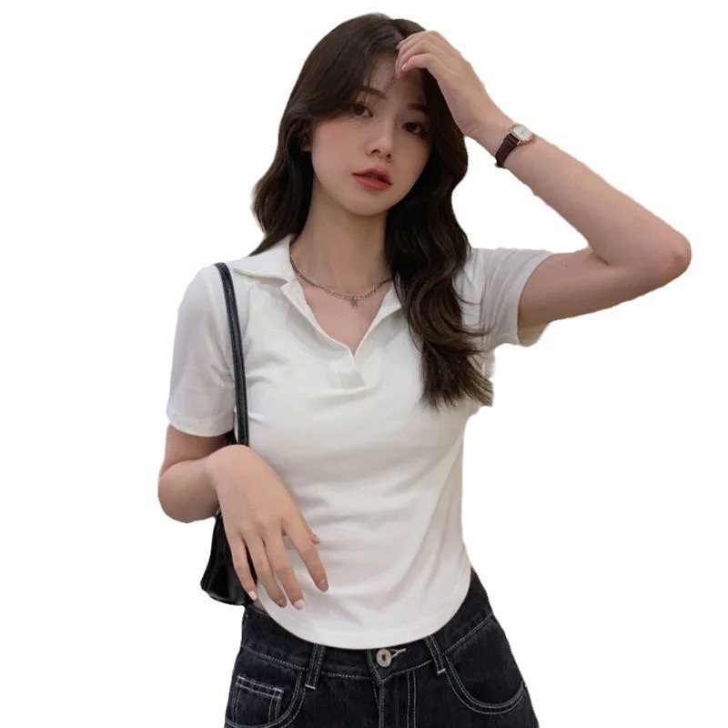 白色Polo领短袖t恤女修身新款纯欲风别致设计感小众外穿弧形上衣