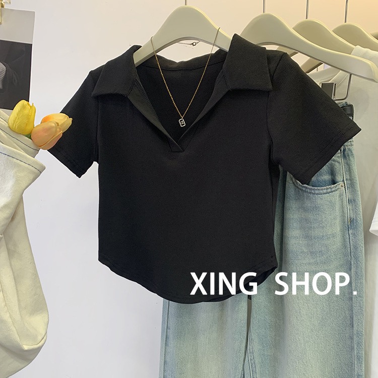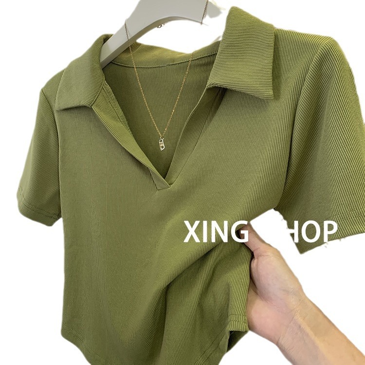 绿色polo衫翻领短袖正肩t恤女夏季新款设计感小众短款上衣