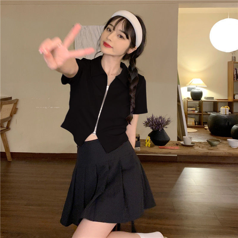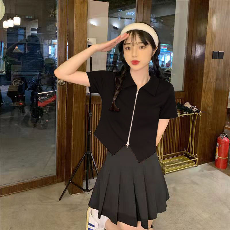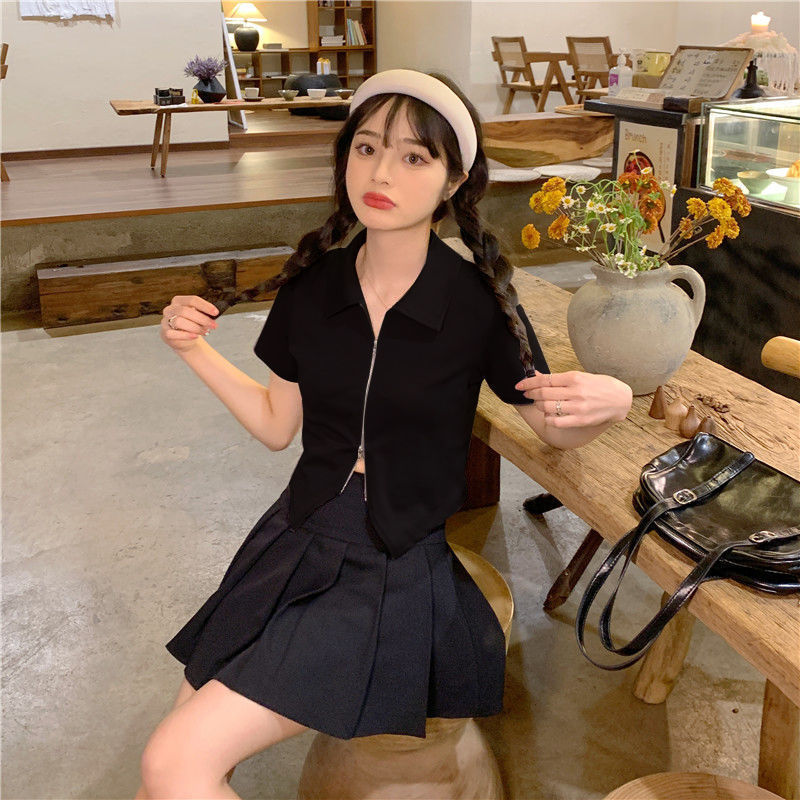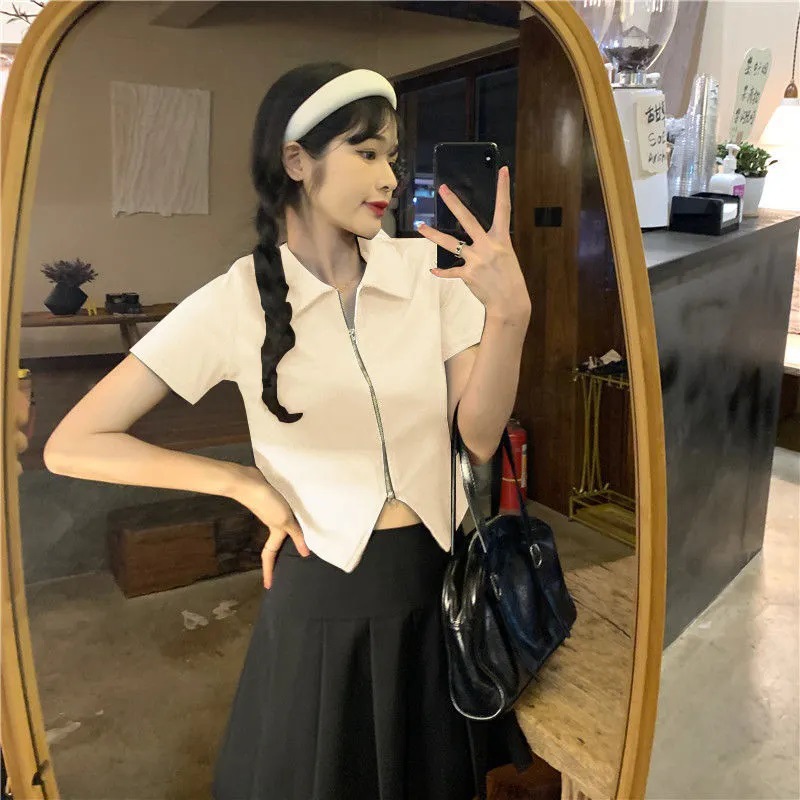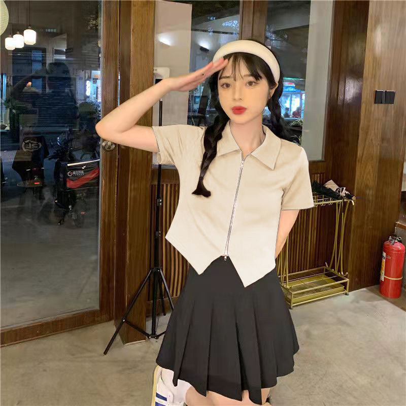 短款设计感双拉链polo领短袖上衣女夏季新款修身显瘦休闲开衫外套