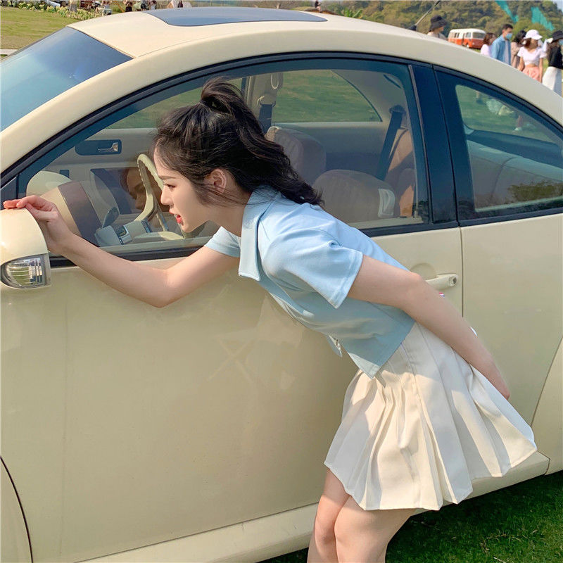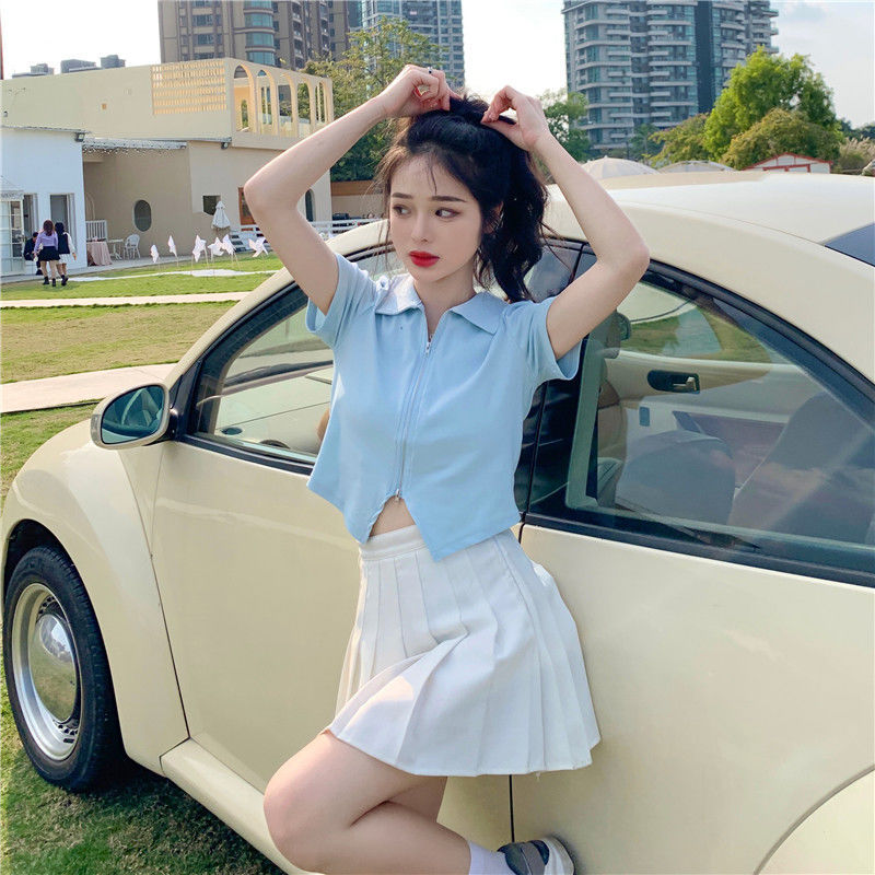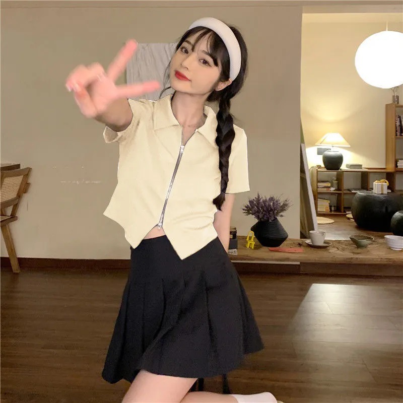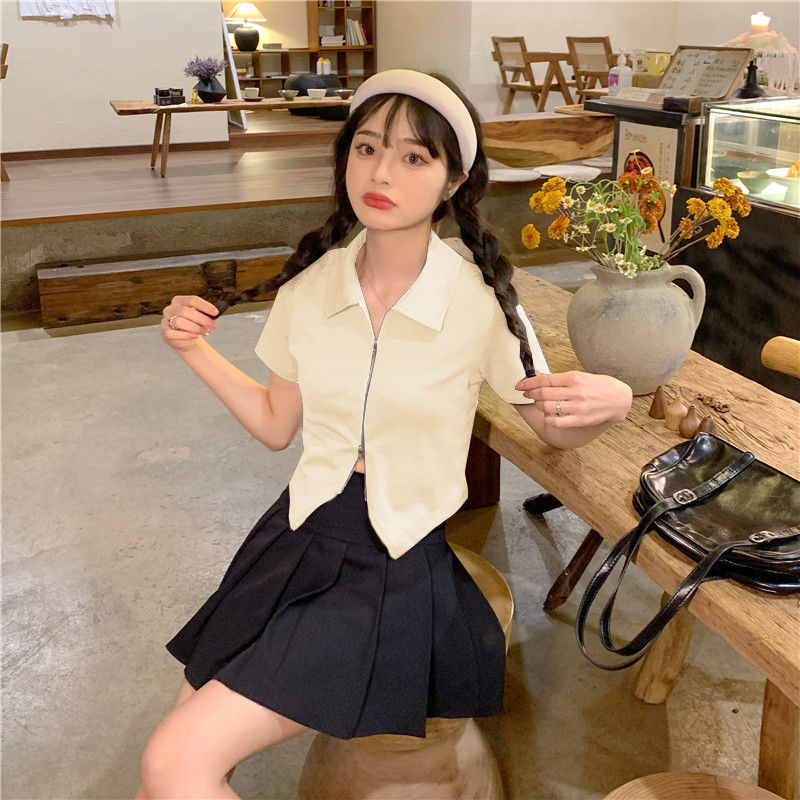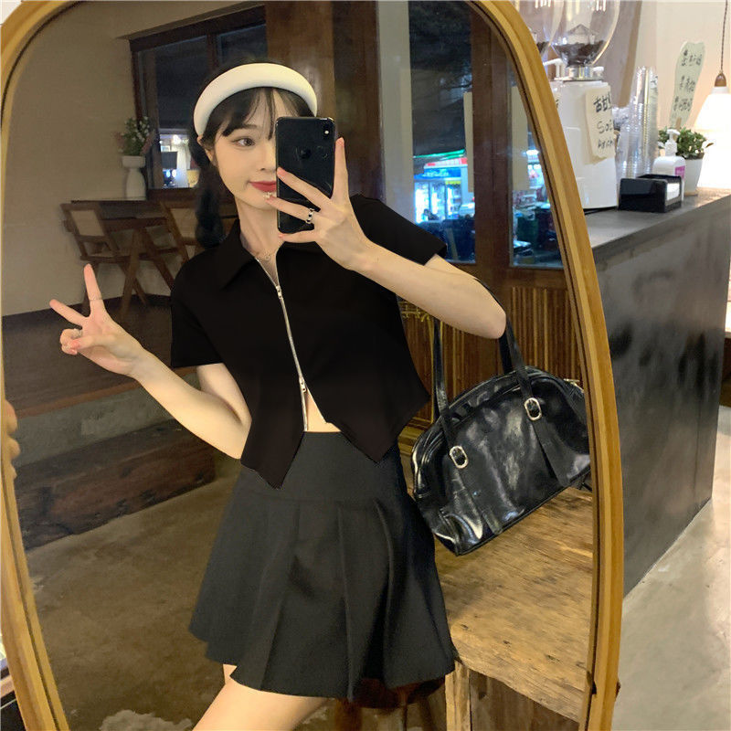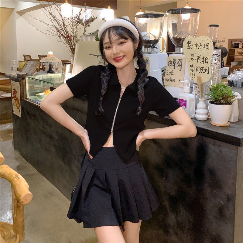 短款设计感双拉链polo领短袖上衣女夏季新款修身显瘦休闲开衫外套