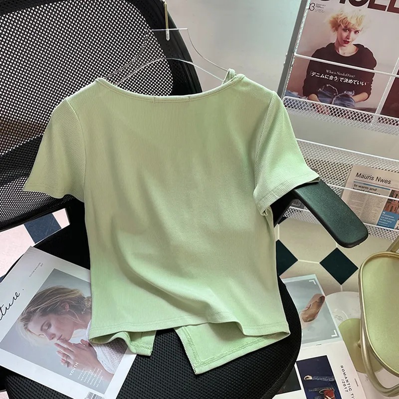 夏季设计感小众独特V领短袖t恤女韩版chic别致不规则短款纯欲上衣