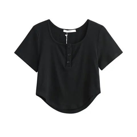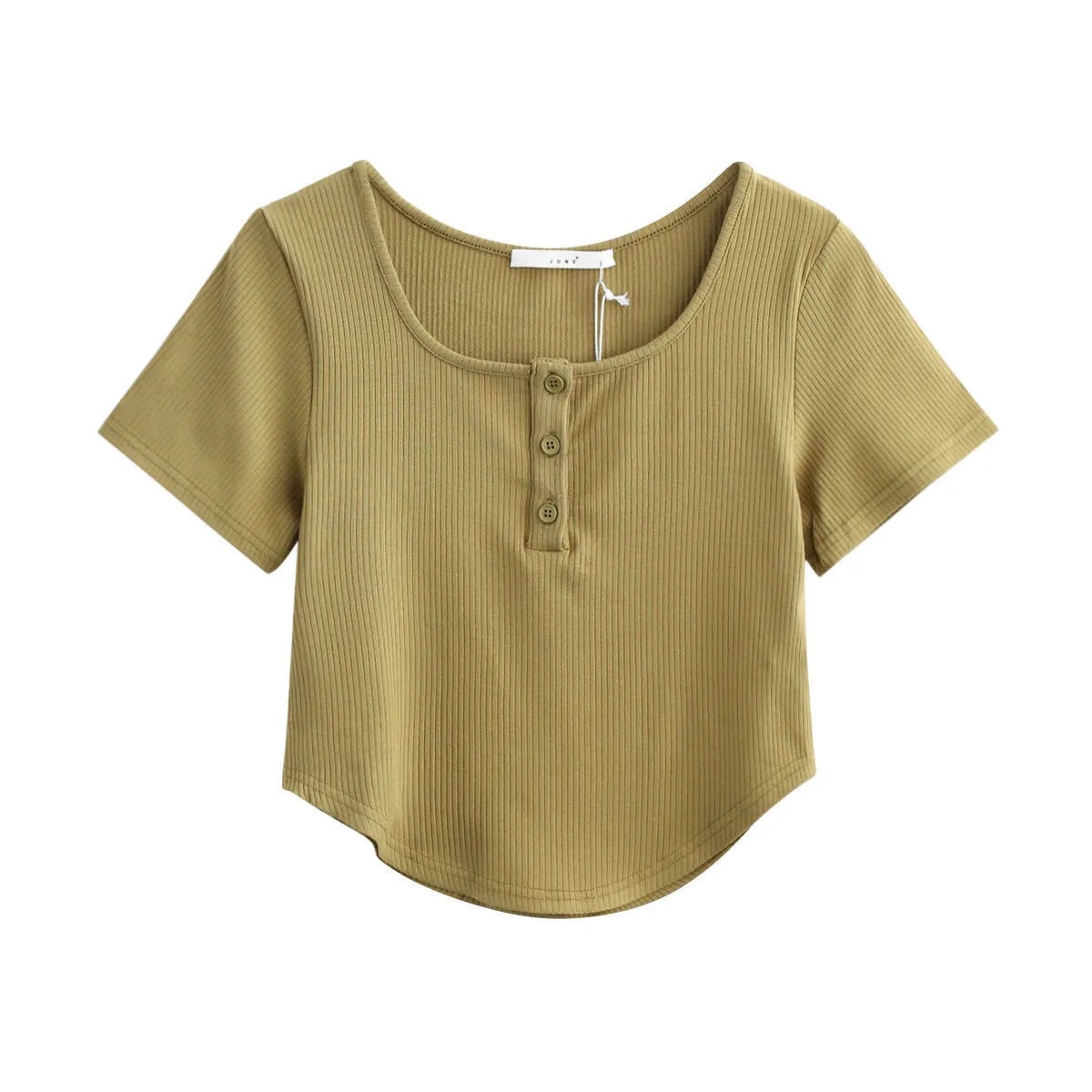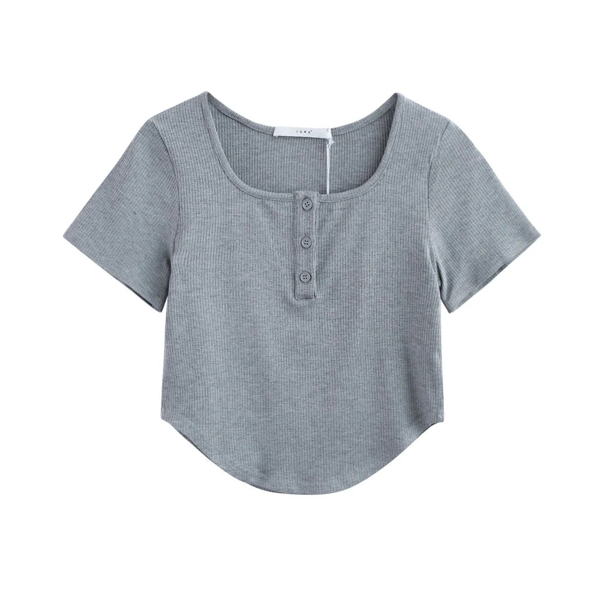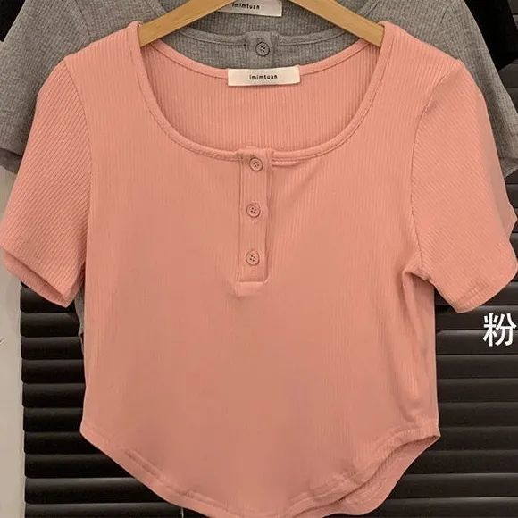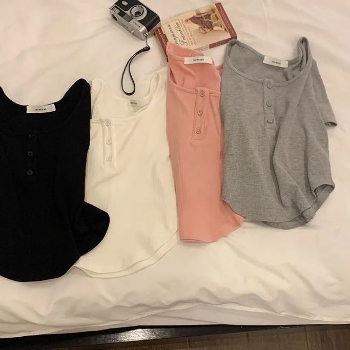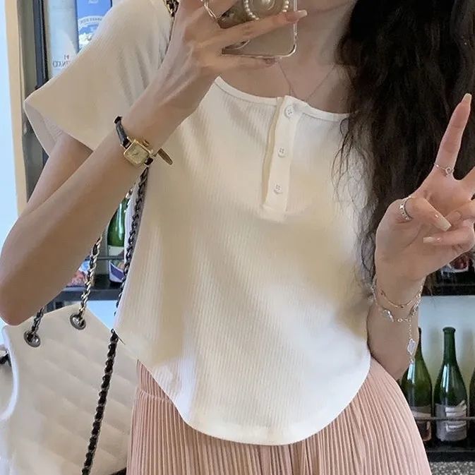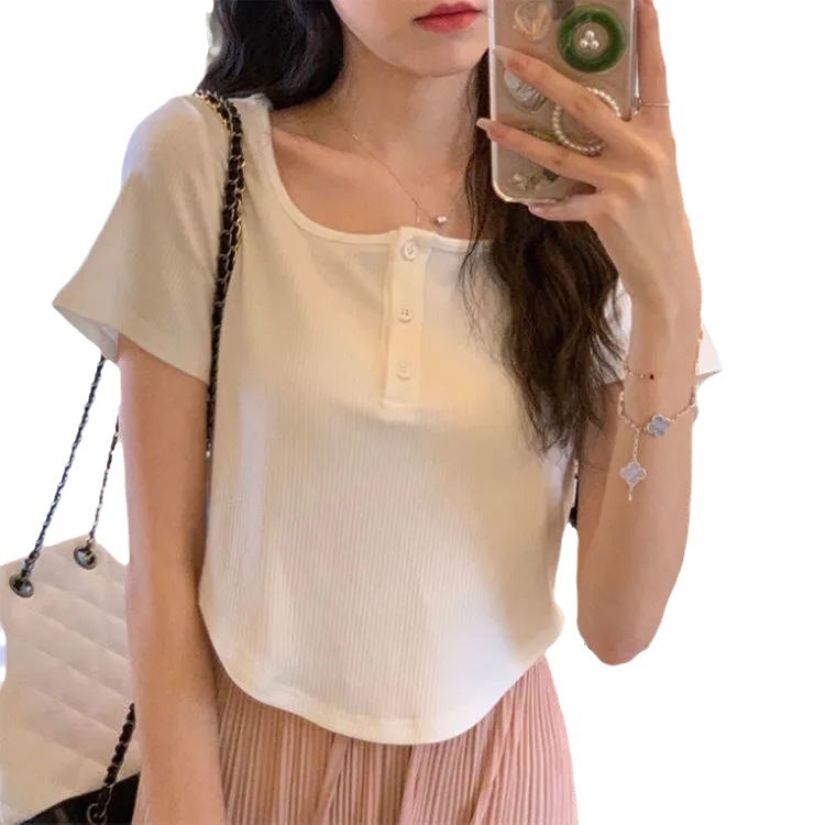 港味露锁骨撞色U领短袖T恤女夏季新款韩版百搭显瘦打底上衣