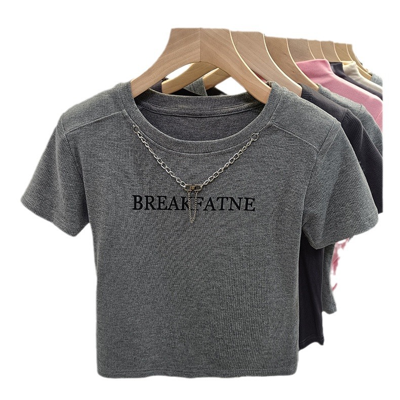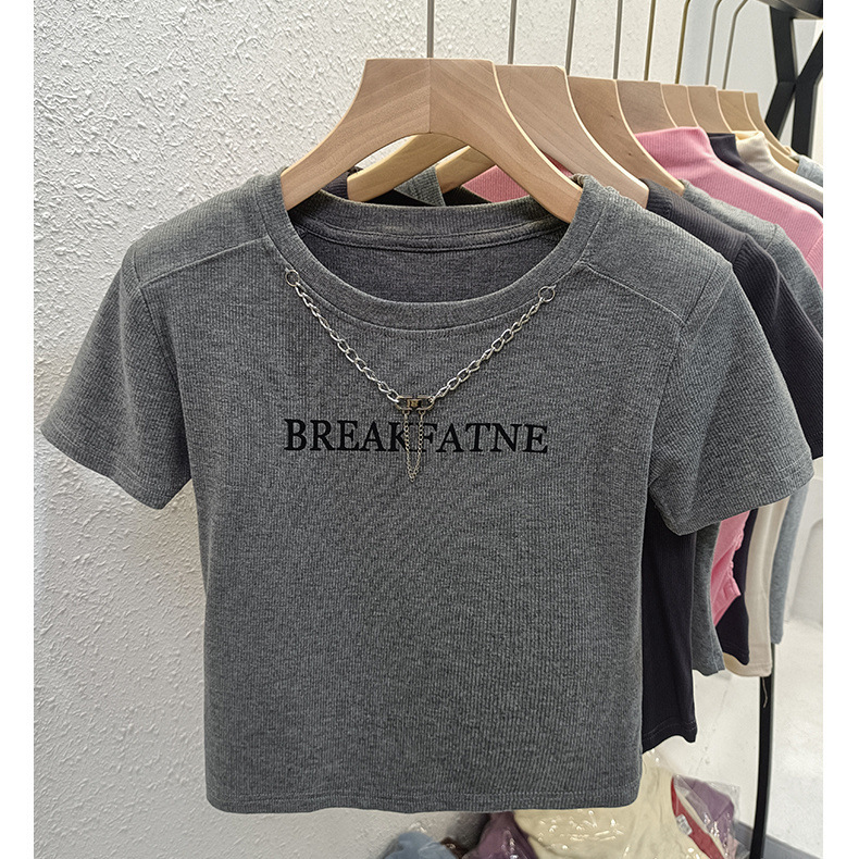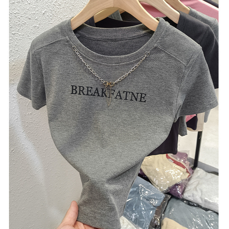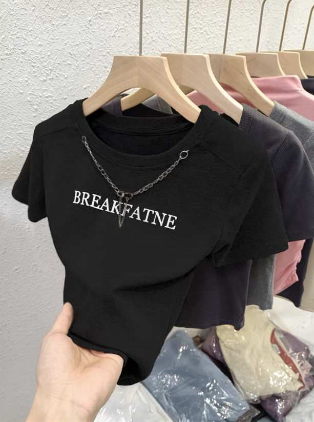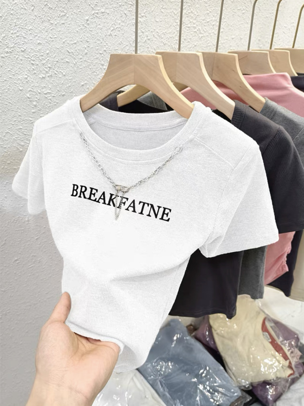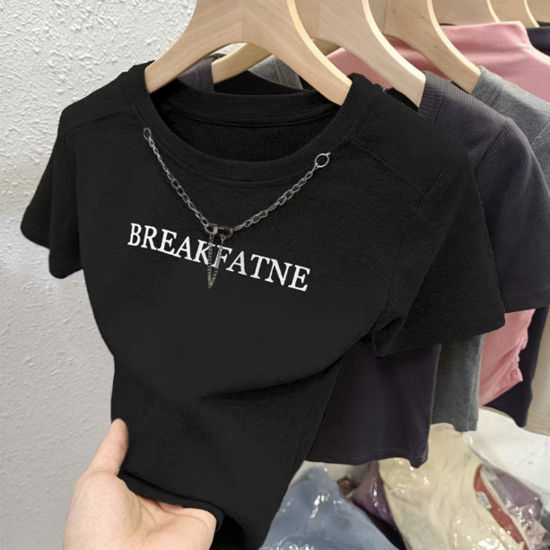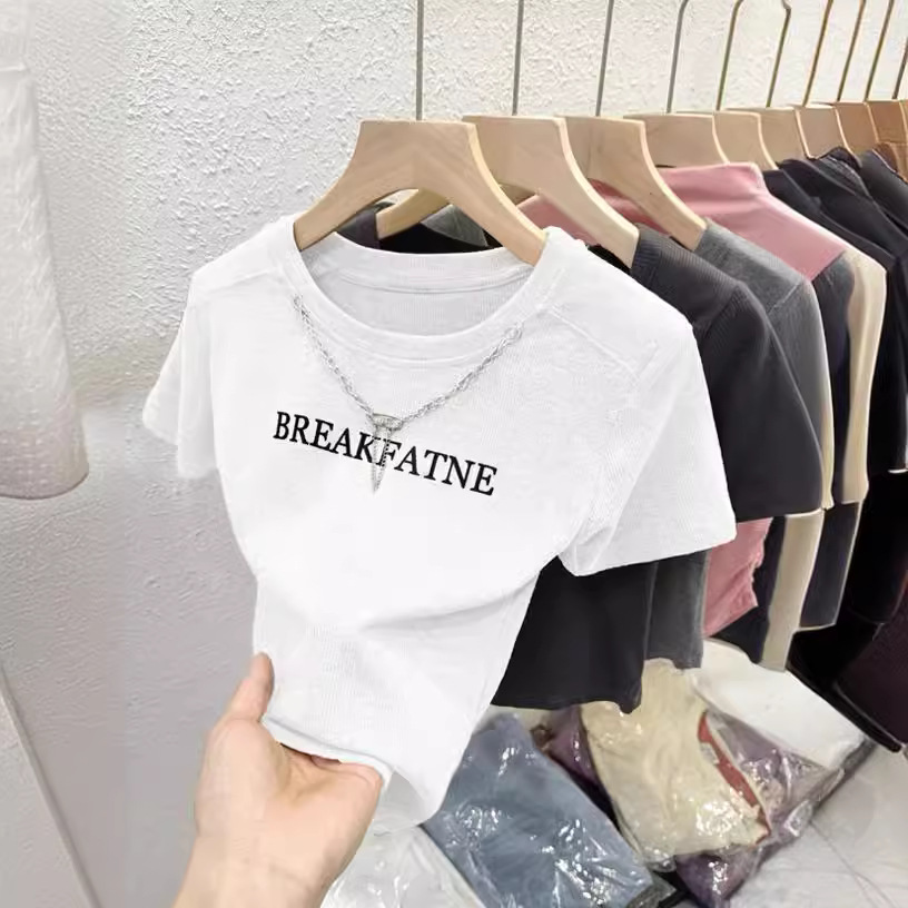 短袖t恤女夏季新款螺纹圆领正肩印花设计感修身短款上衣ins