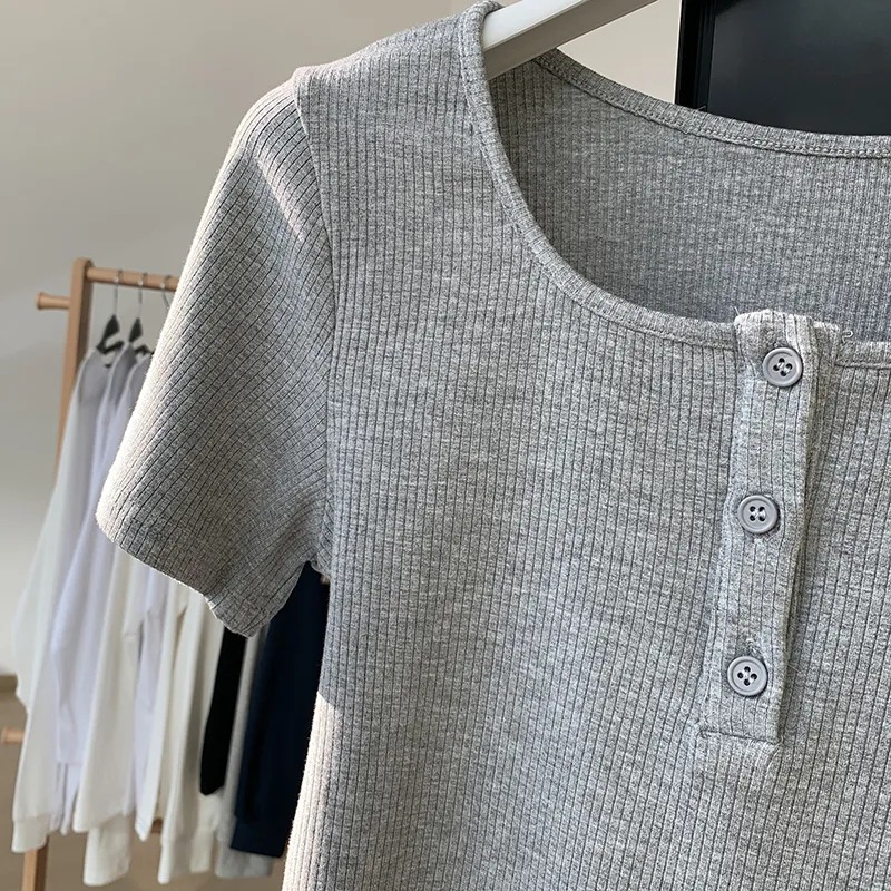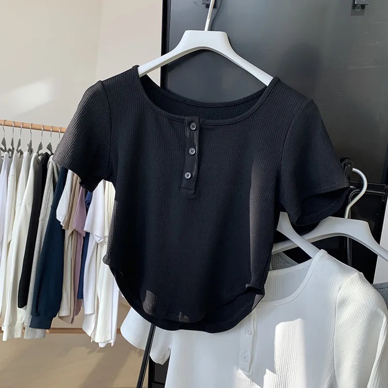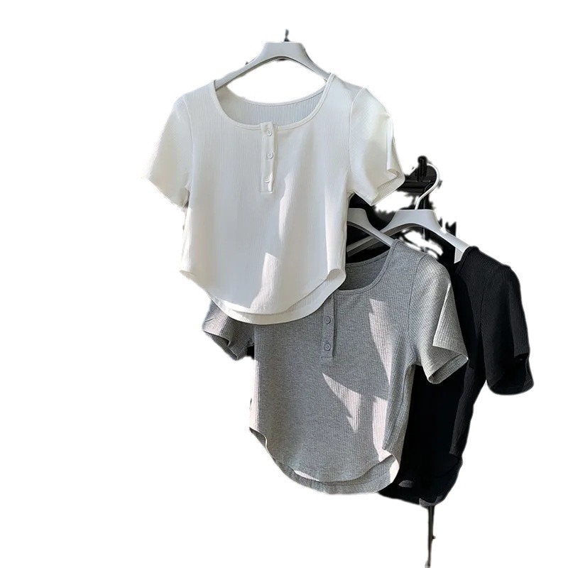 正肩方领T恤女短袖设计感夏新款甜辣妹不规则修身显瘦纯欲上衣潮