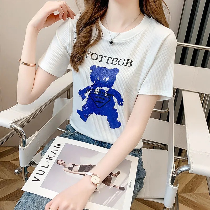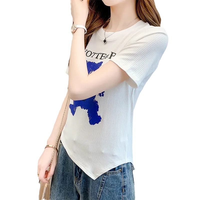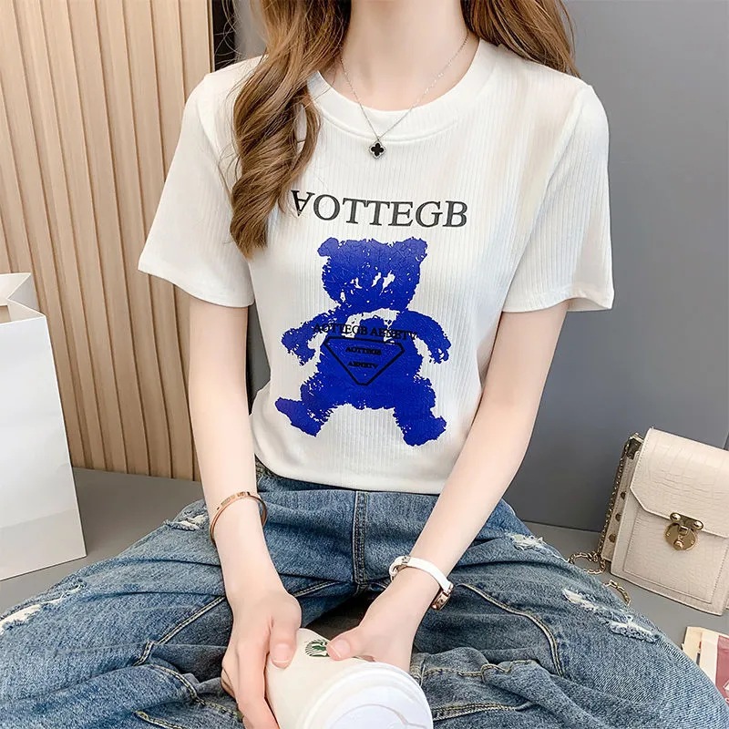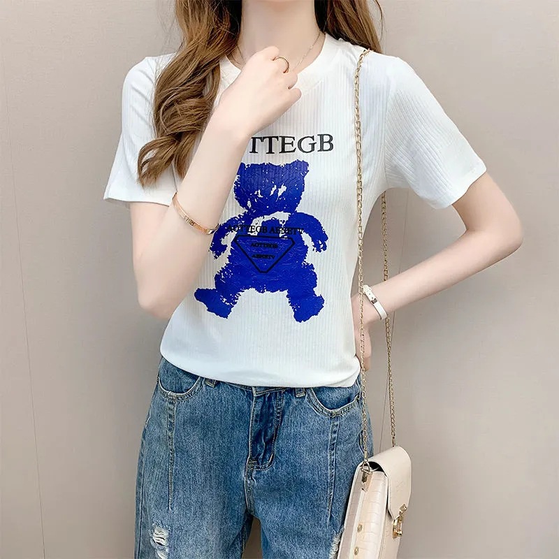 白色圆领小熊印花不规则短袖t恤女夏季新款时尚修身显瘦上衣
