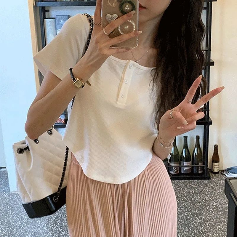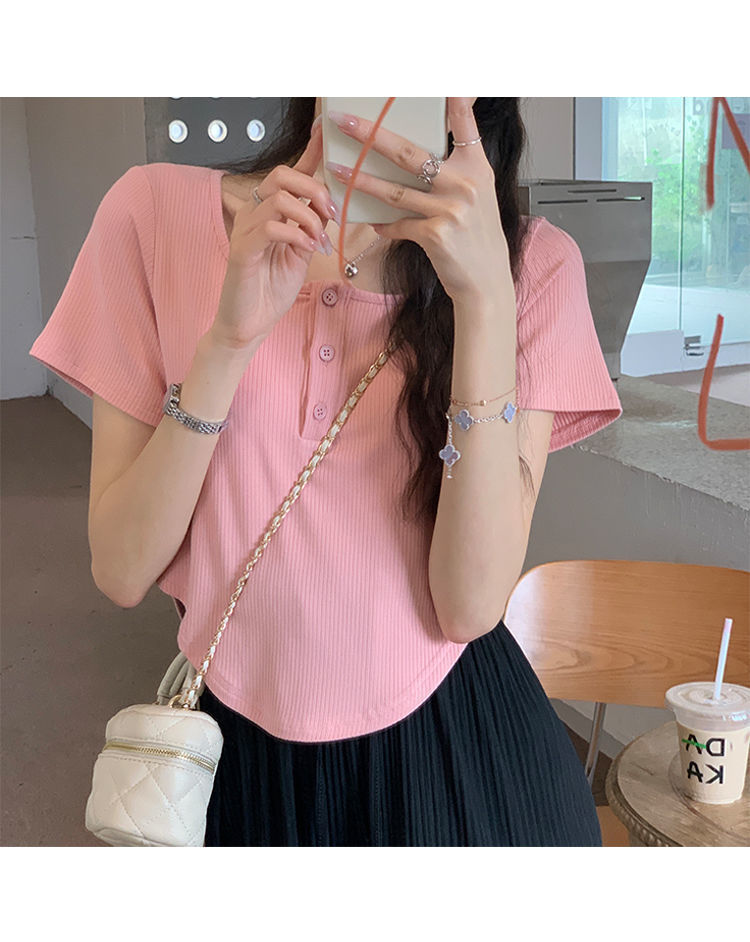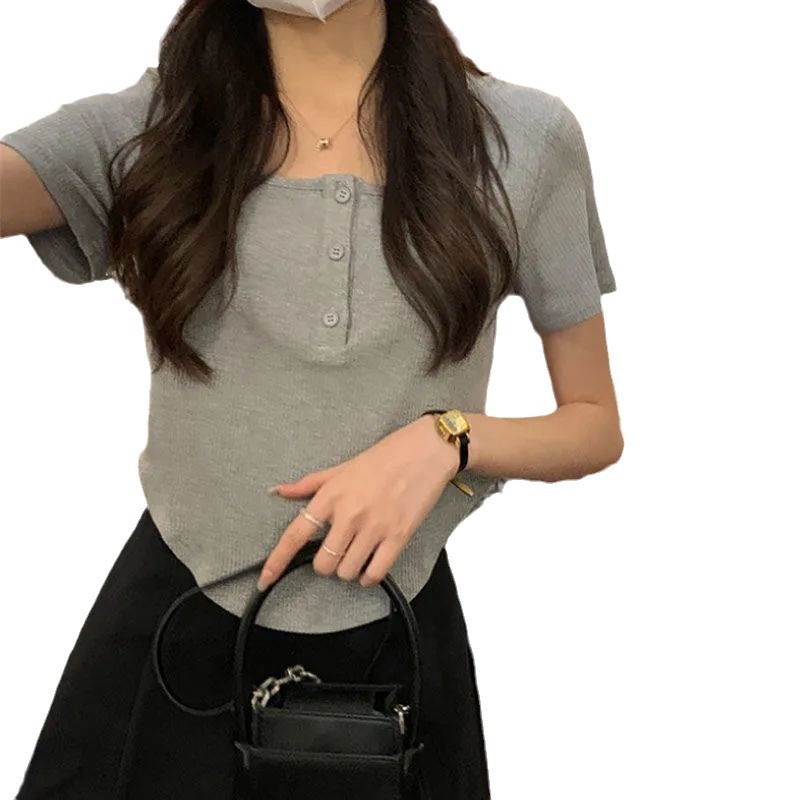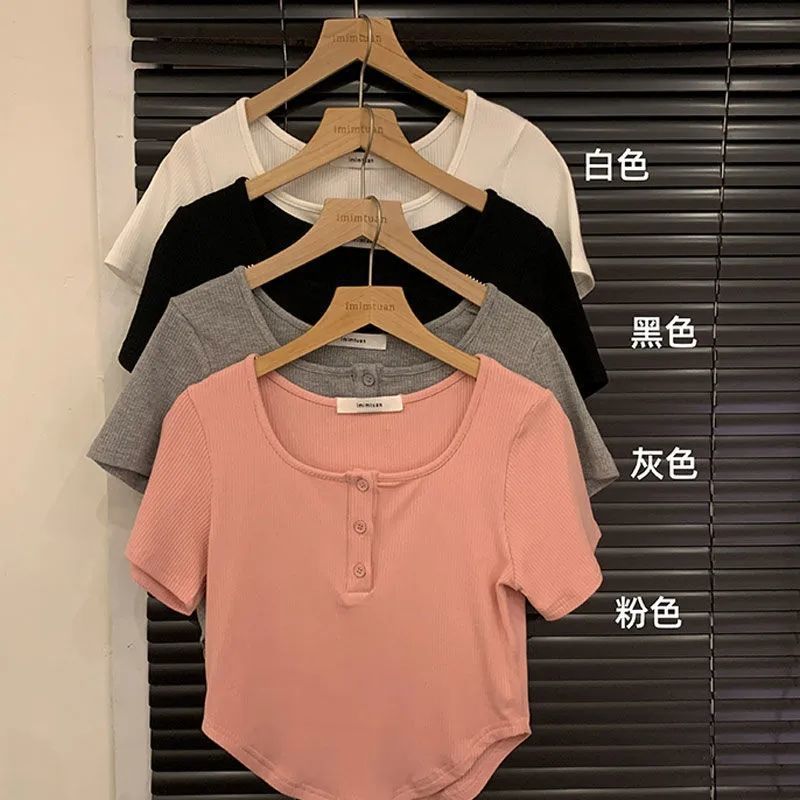 冰丝螺纹短袖t恤女夏薄款新款ins网红气质显瘦u领不规则上衣