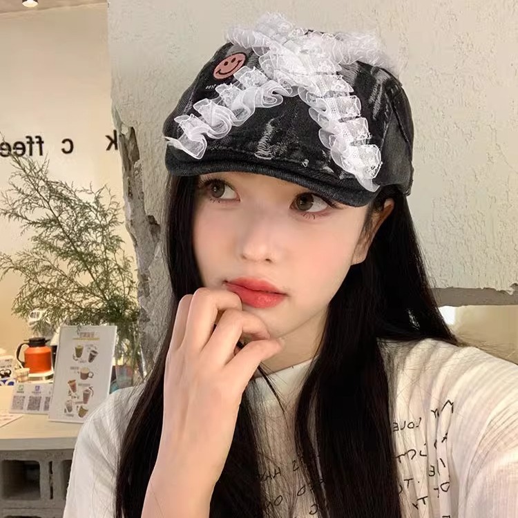鸭舌帽子新款报童帽蕾丝做旧水洗牛仔前进帽子日系百搭鸭嘴帽