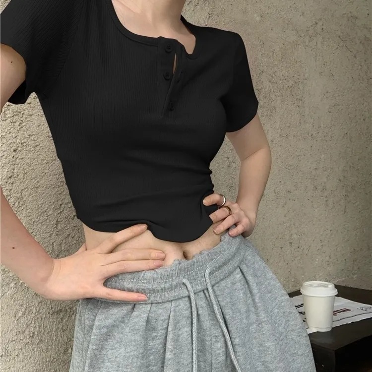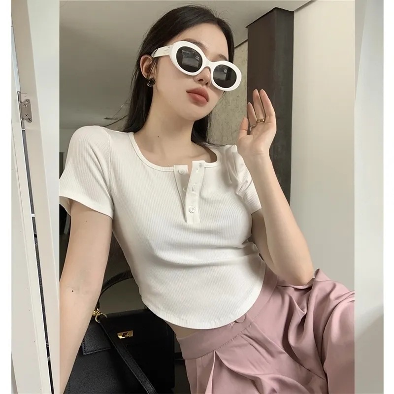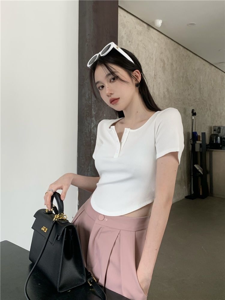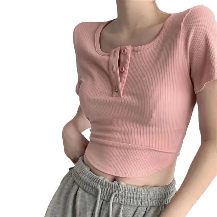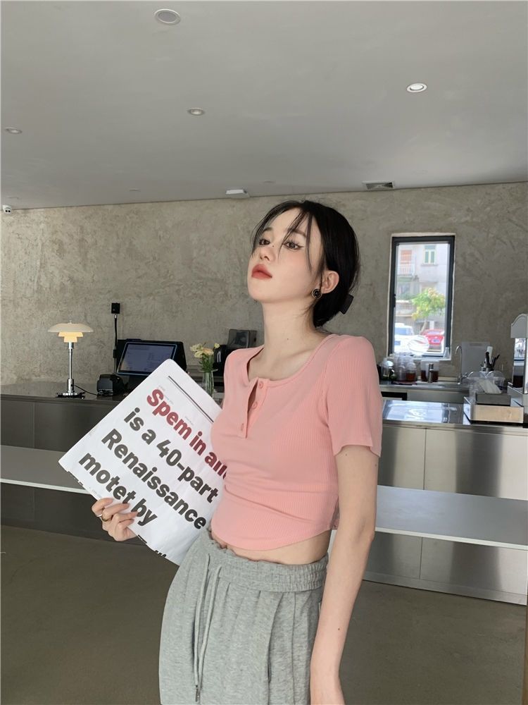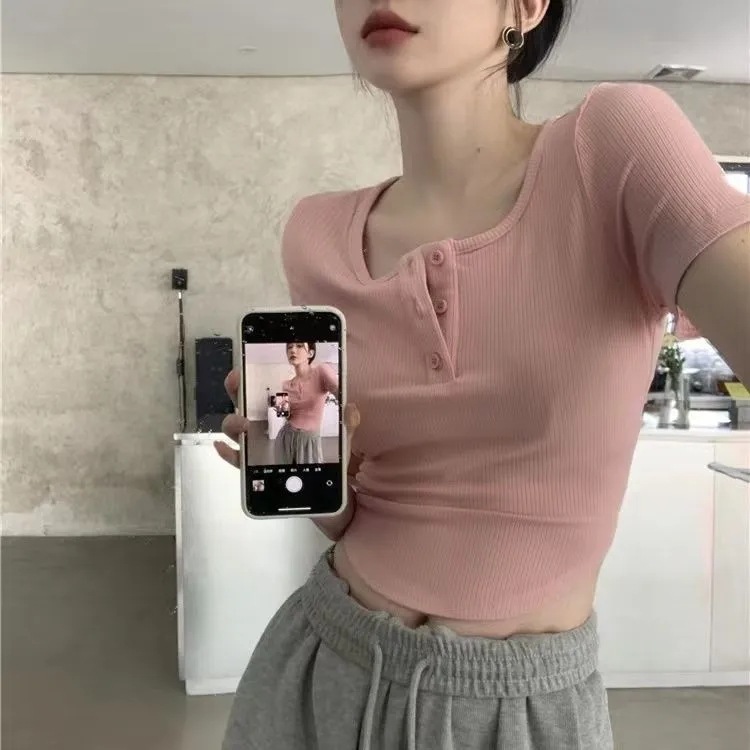 纯欲风T恤女ins潮夏季粉色甜辣妹不规则别致修身显瘦短袖上衣