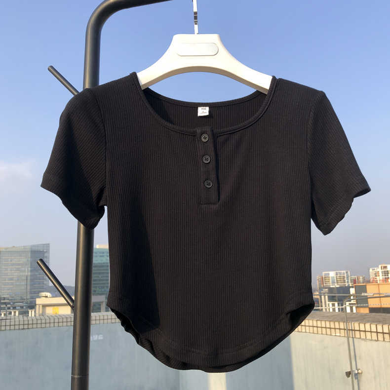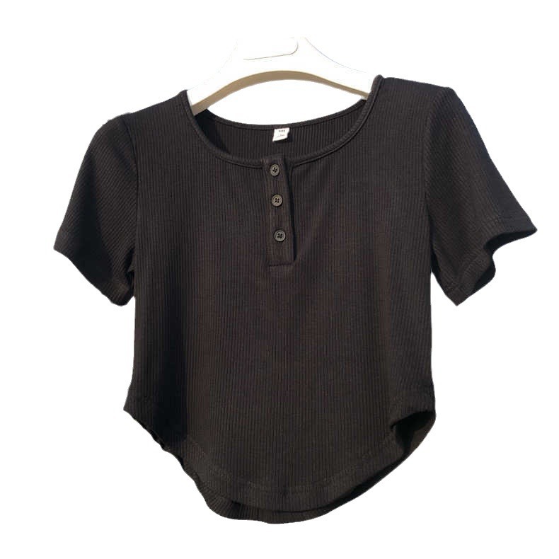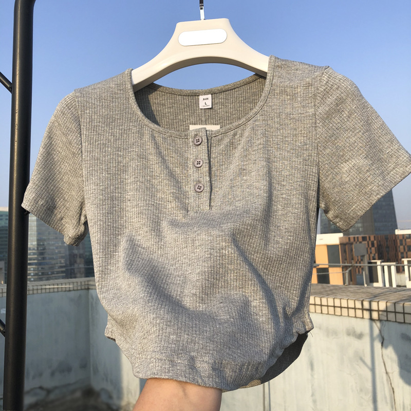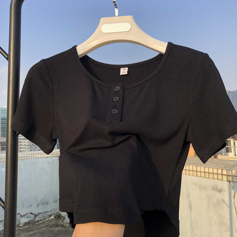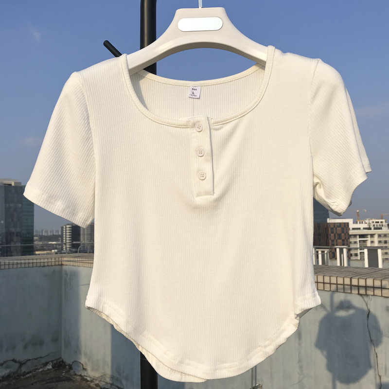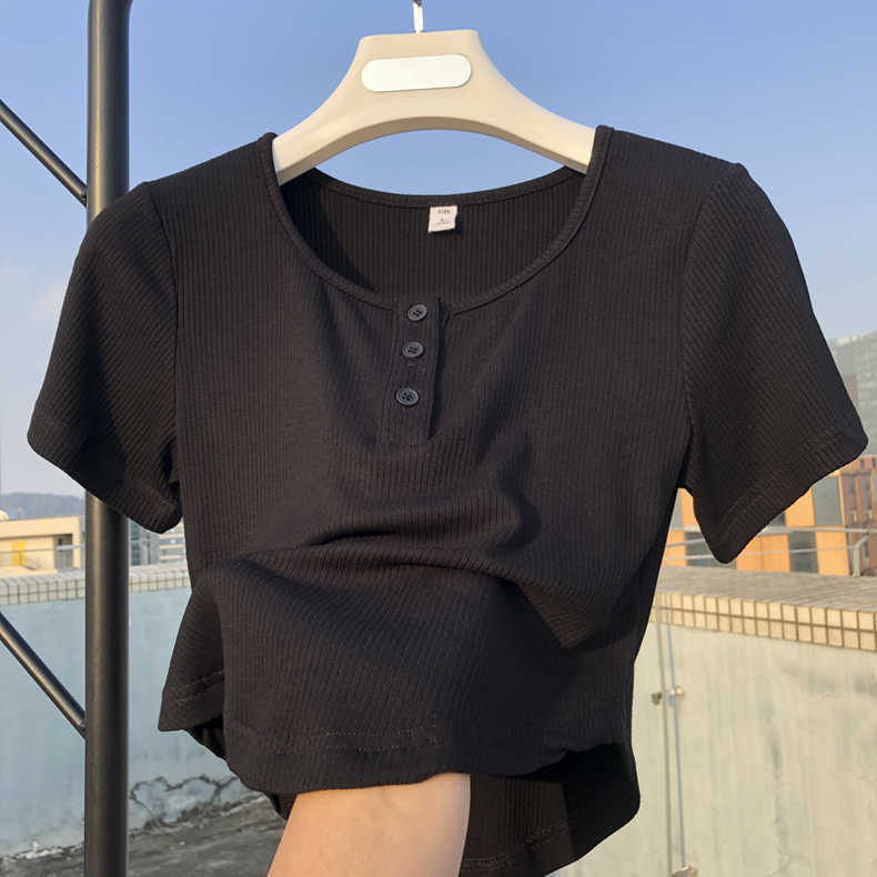 短袖t恤女短款修身夏季新款纯色三粒扣正肩方领百搭显瘦上衣