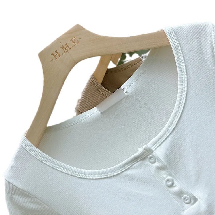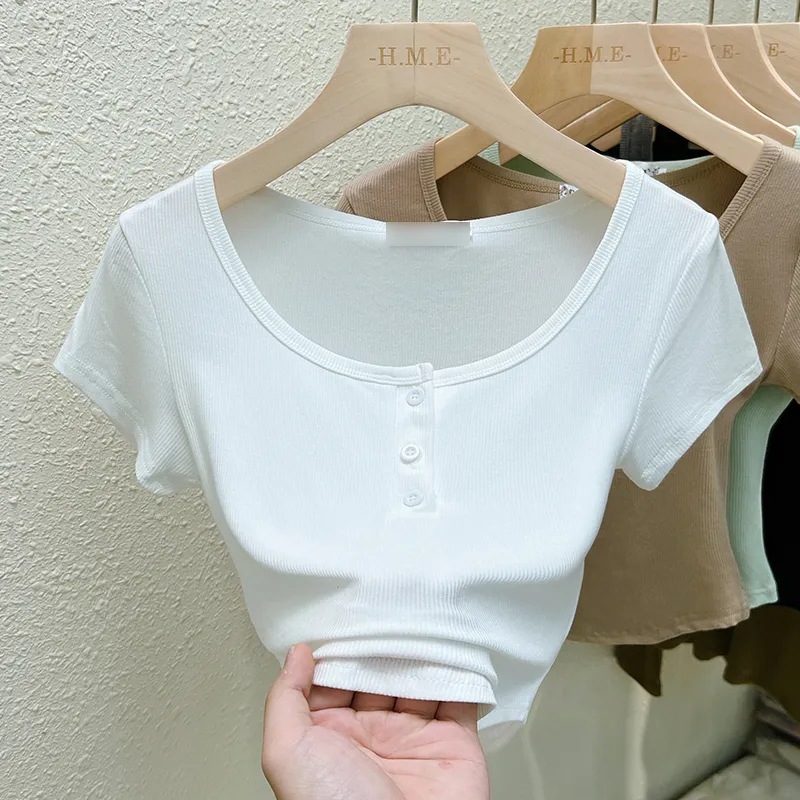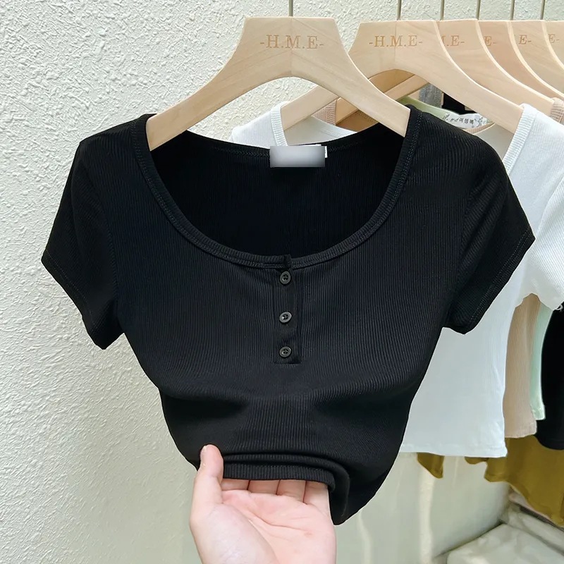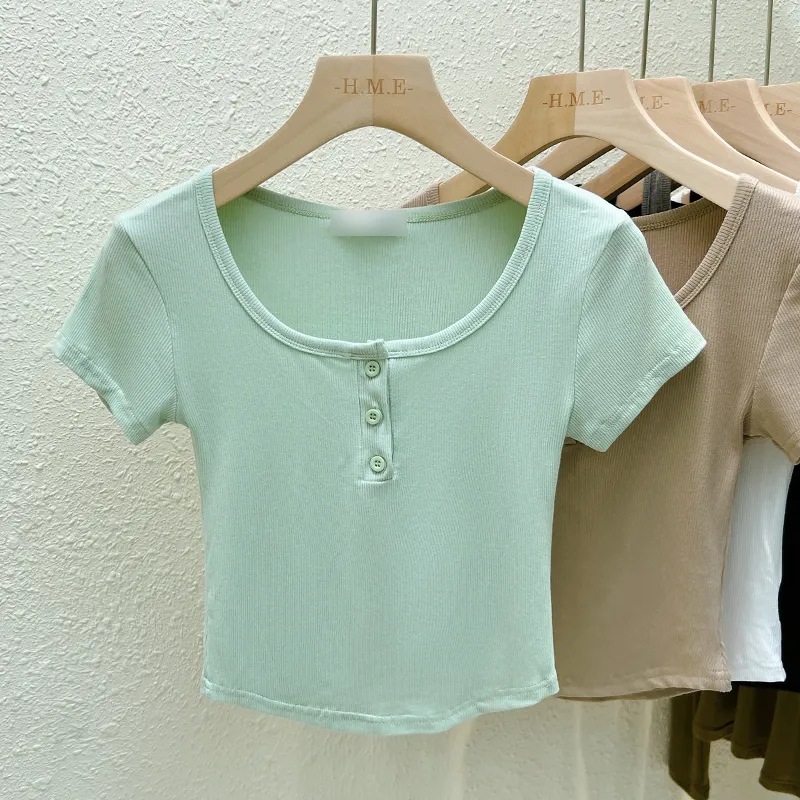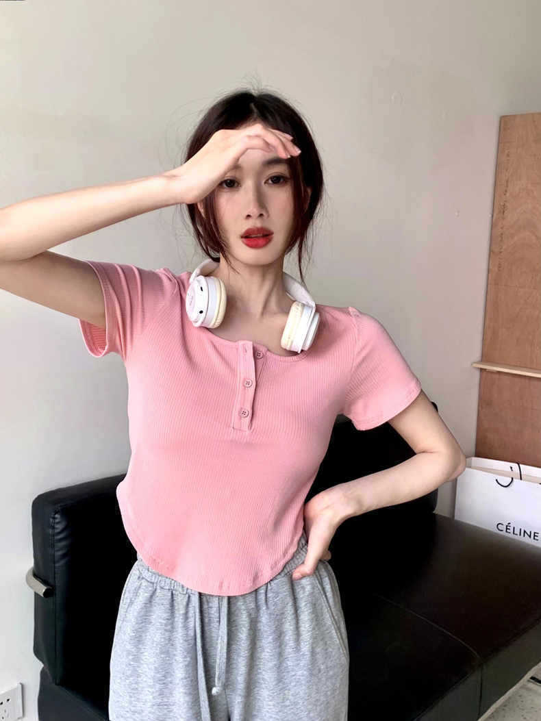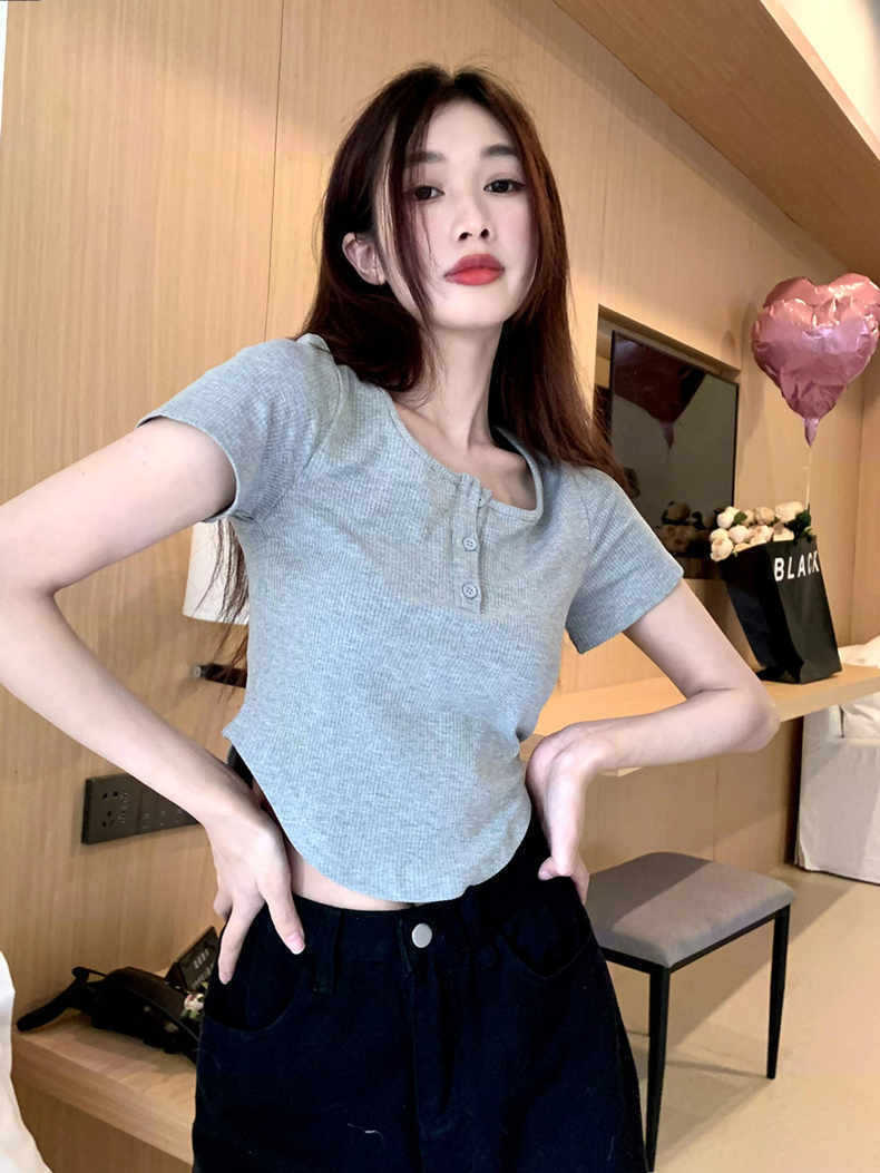 甜辣半开领短袖t恤女夏季新款韩版修身显瘦不规则短款打底衫