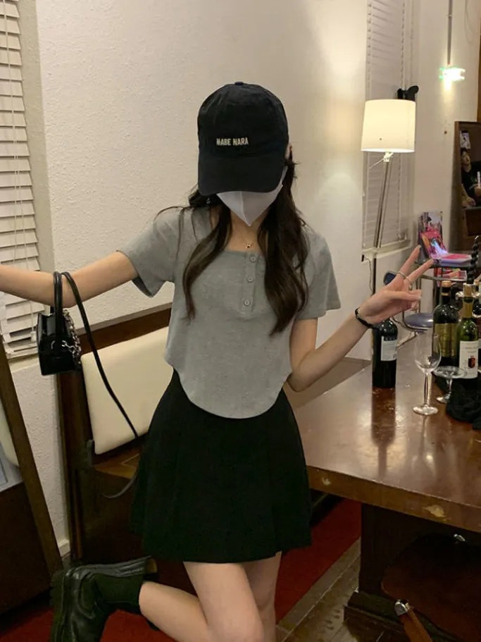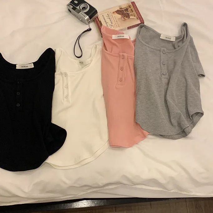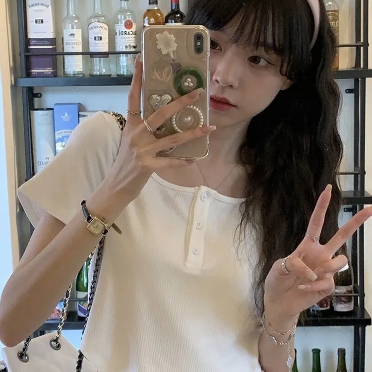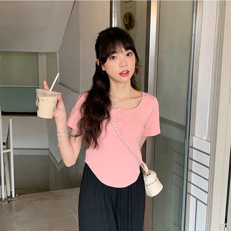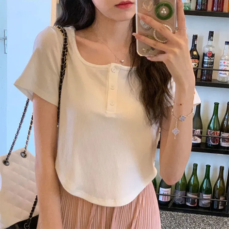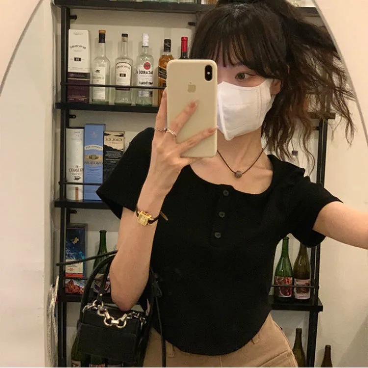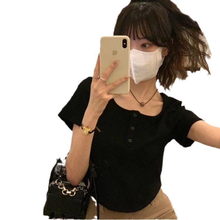 半开领纽扣正肩u领短袖t恤女夏季韩版设计感小众修身短款内搭上衣