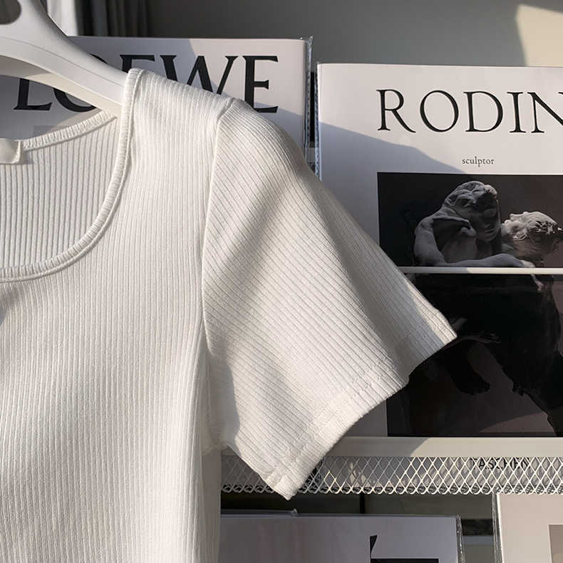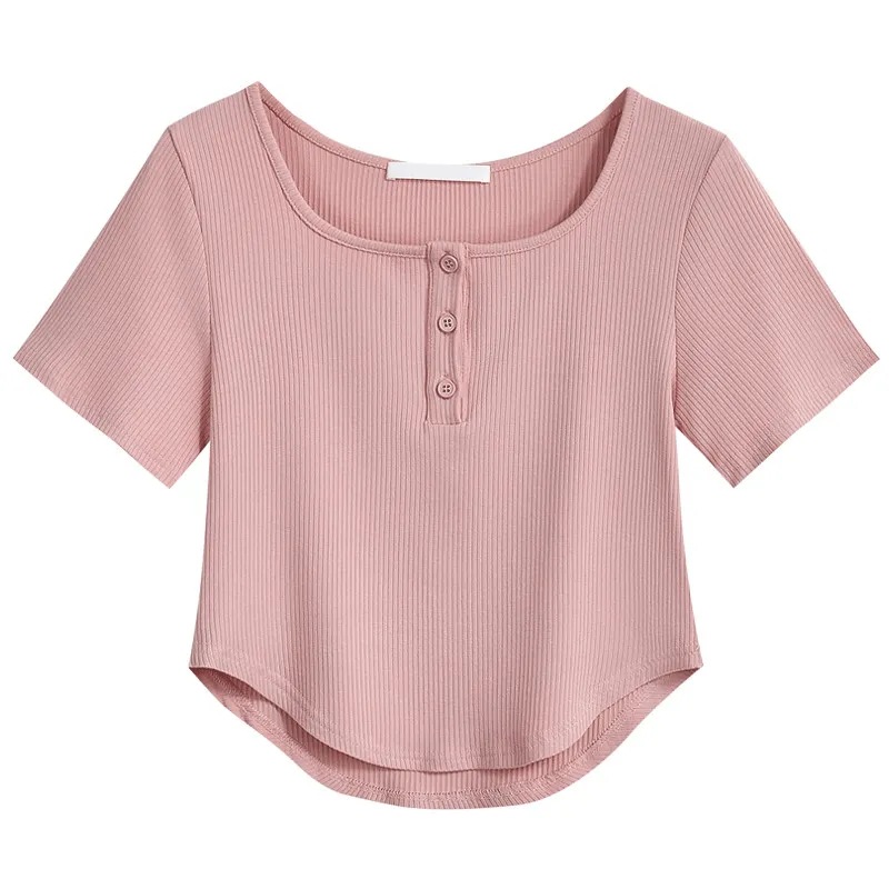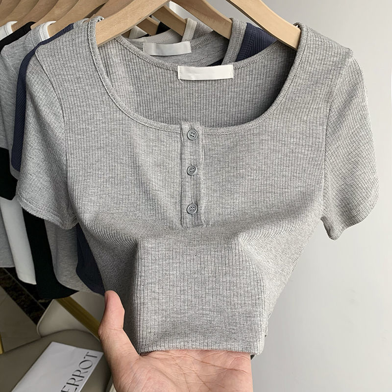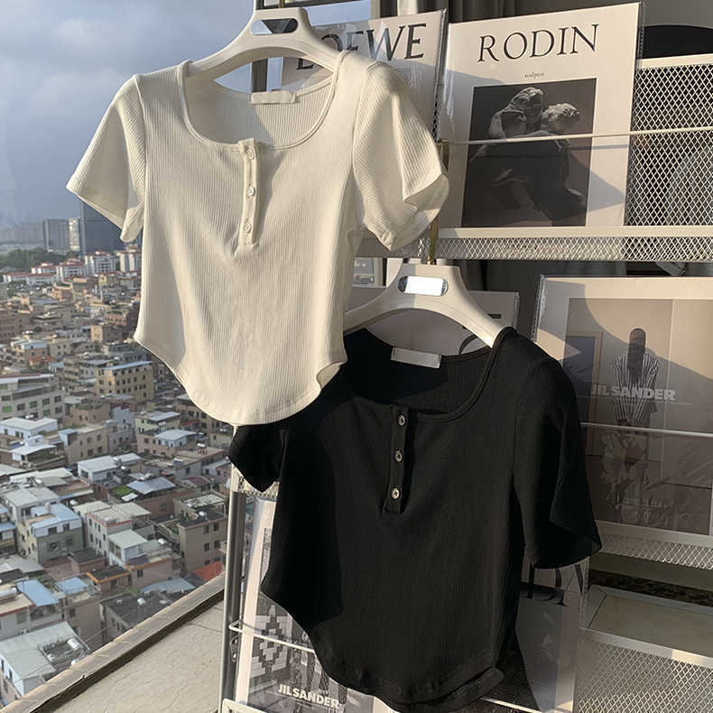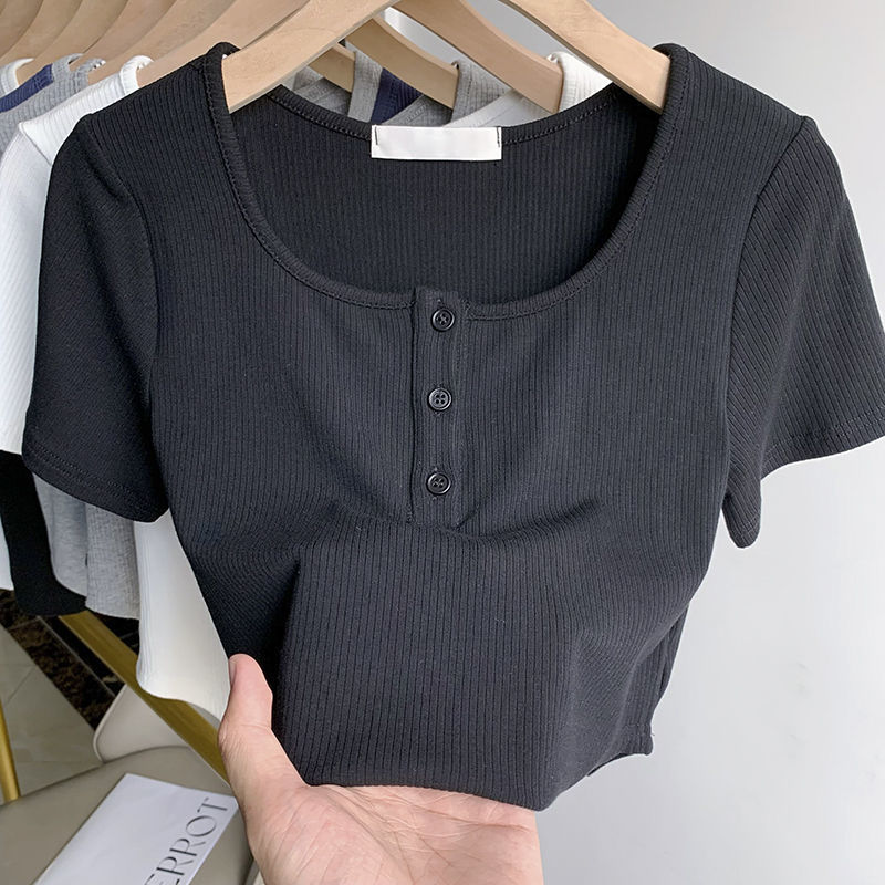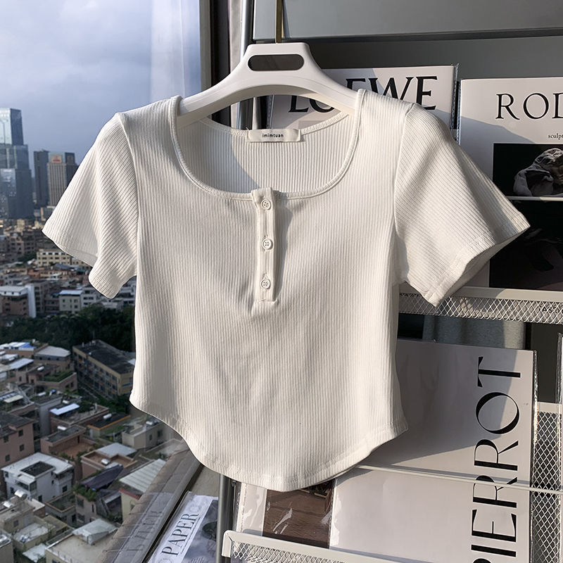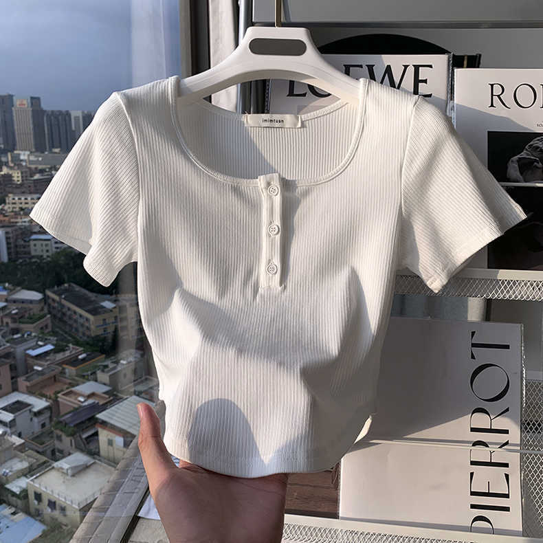 正肩方领纽扣短袖t恤女夏季新款螺纹宽松半袖打底衫短款上衣