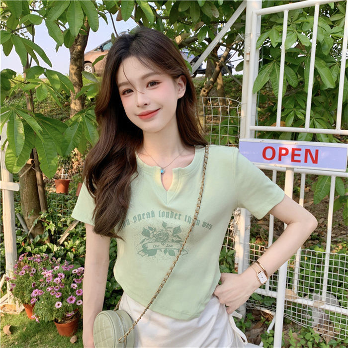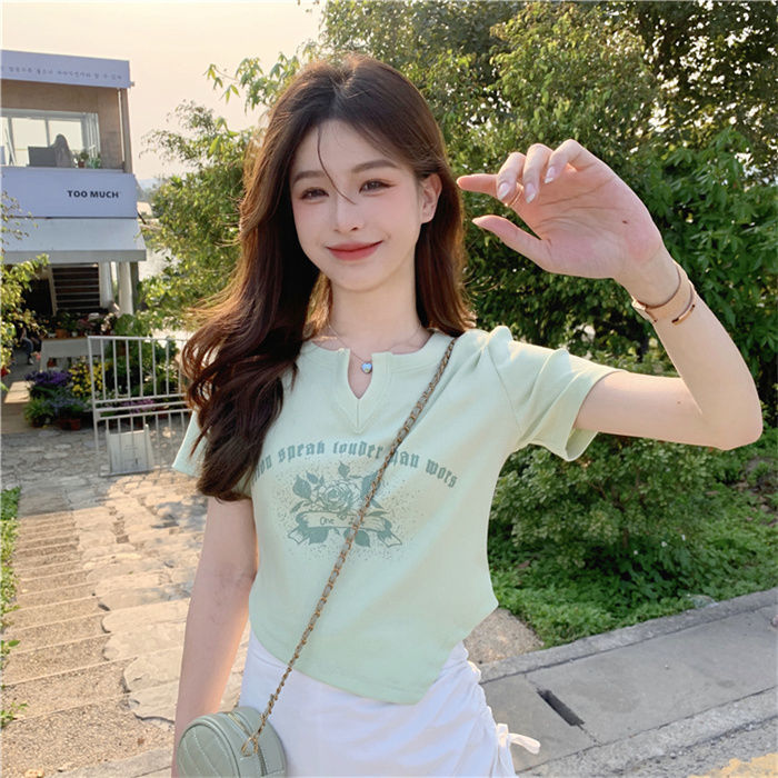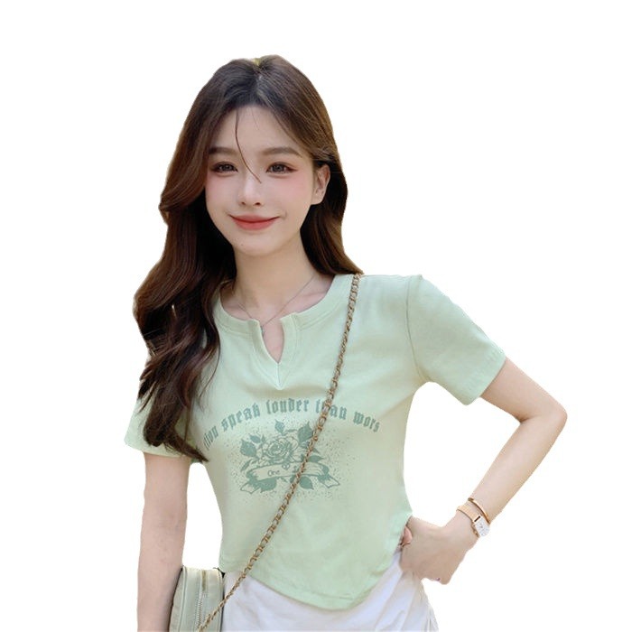 不规则设计感小众v领短袖薄荷绿t恤女修身短款正肩辣妹上衣夏ins