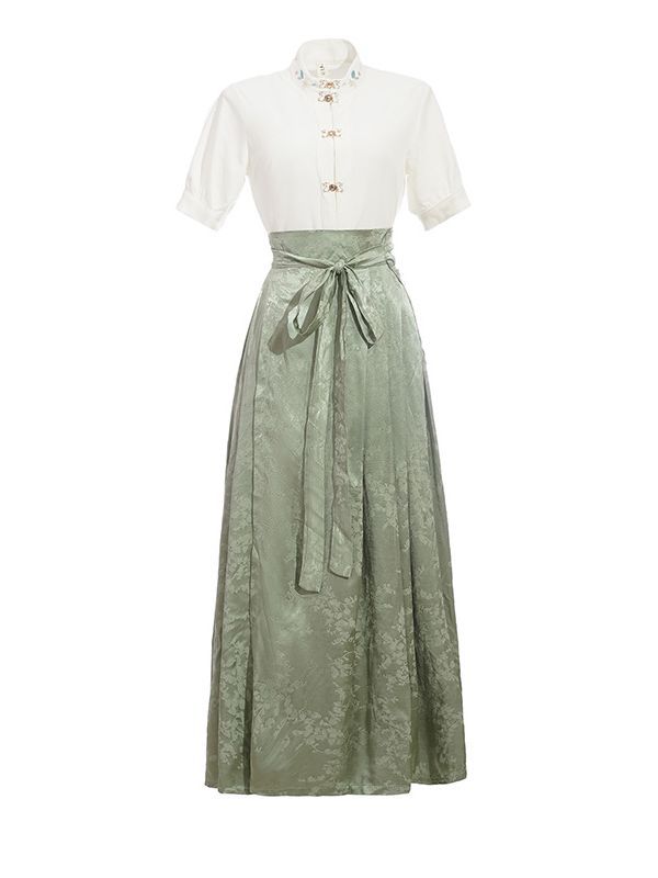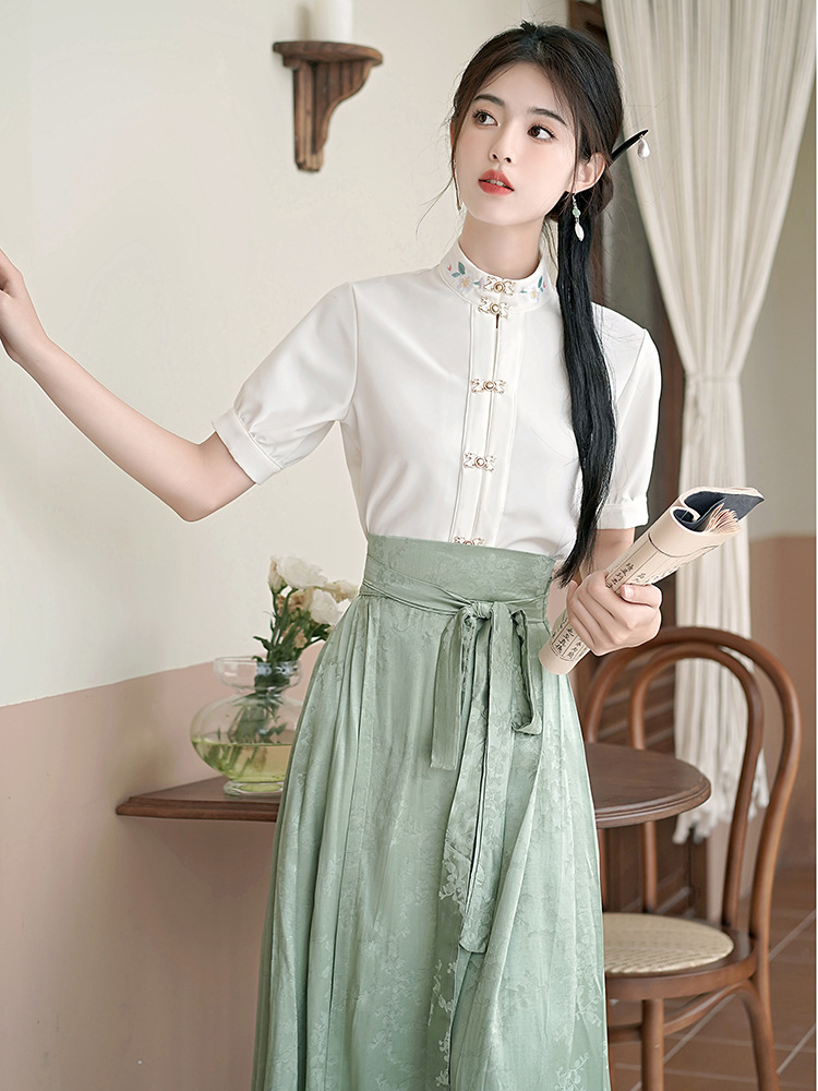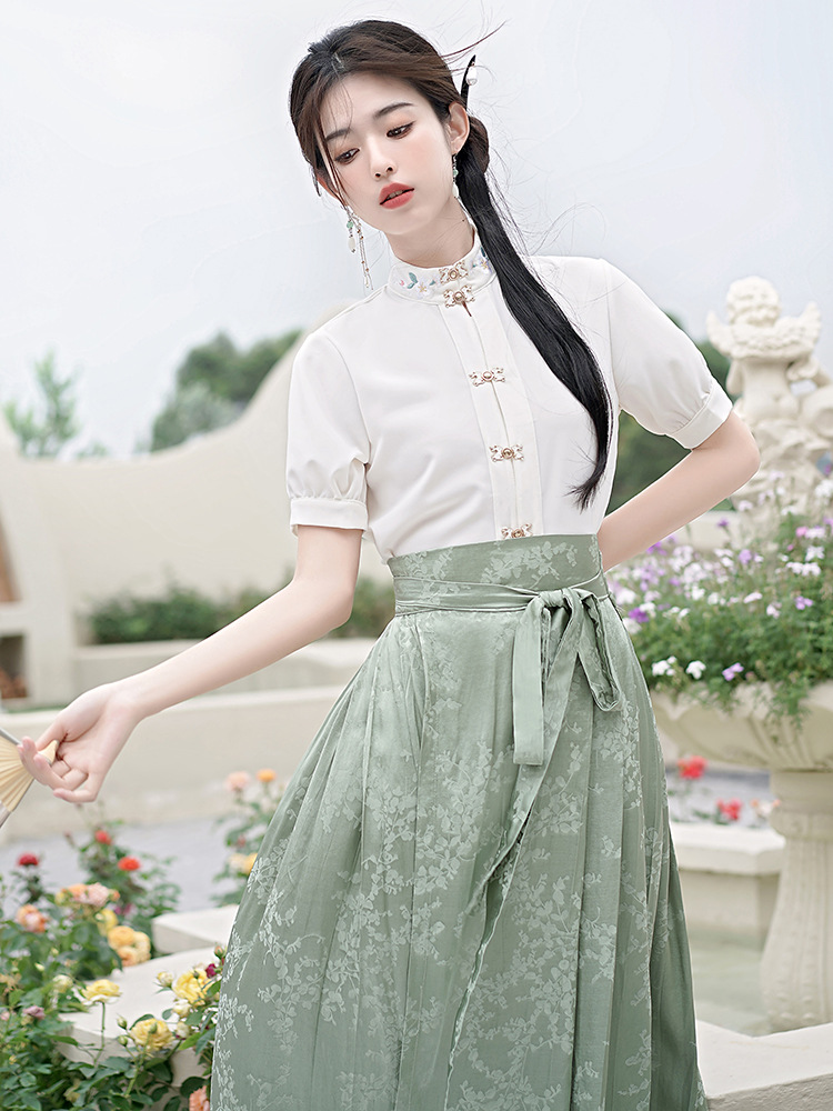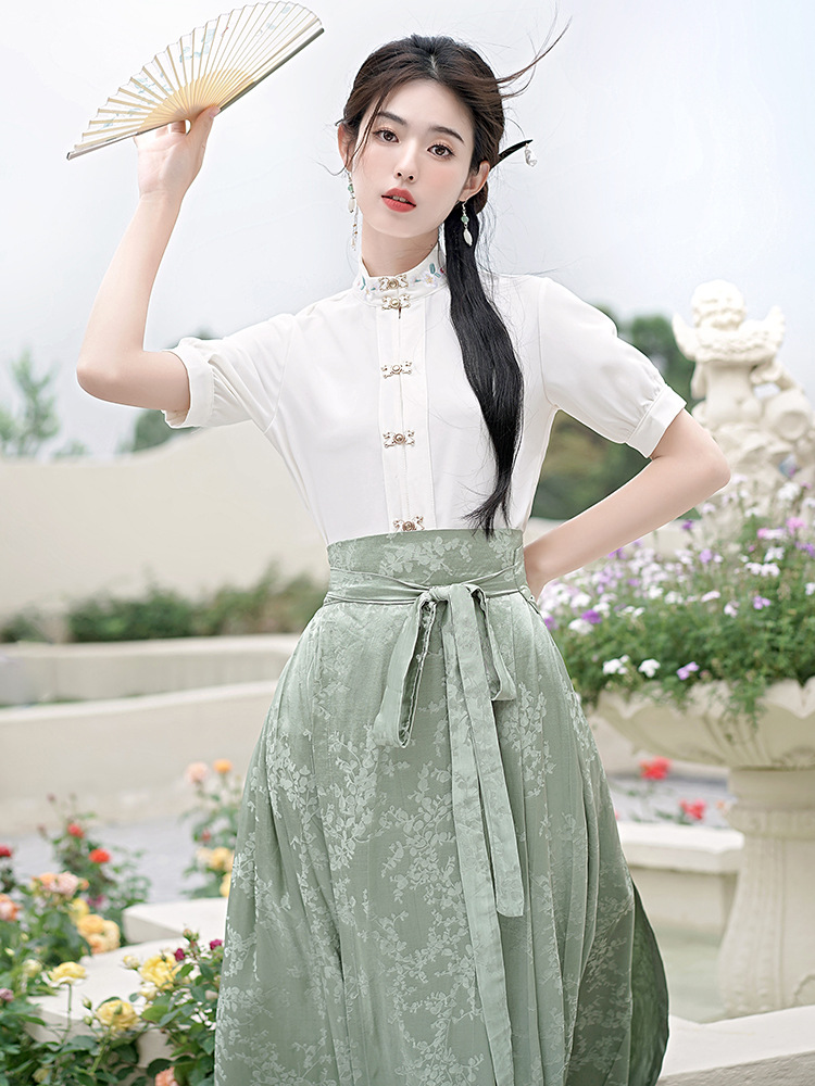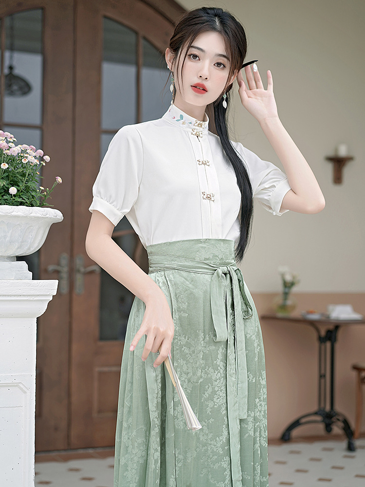 夏季新款新中式刺绣纽扣复古短袖上衣高档提花汉服马面裙套装