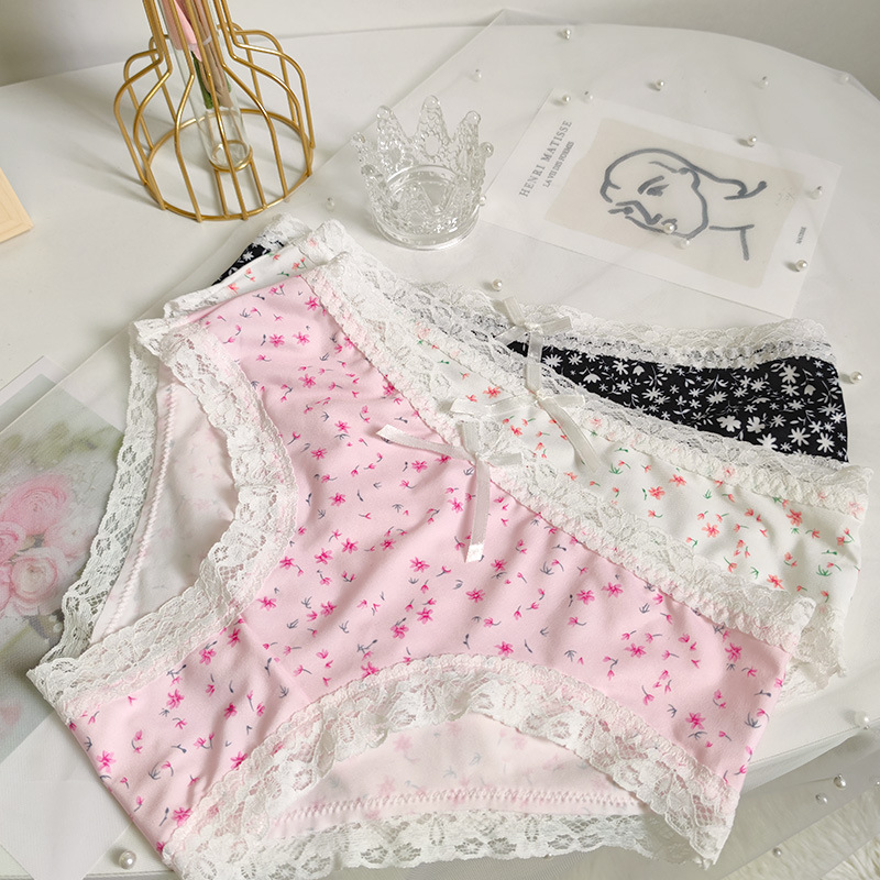 甜粉小花花*夏季日系可爱舒适蕾丝边冰丝少女生碎花甜美低腰内裤