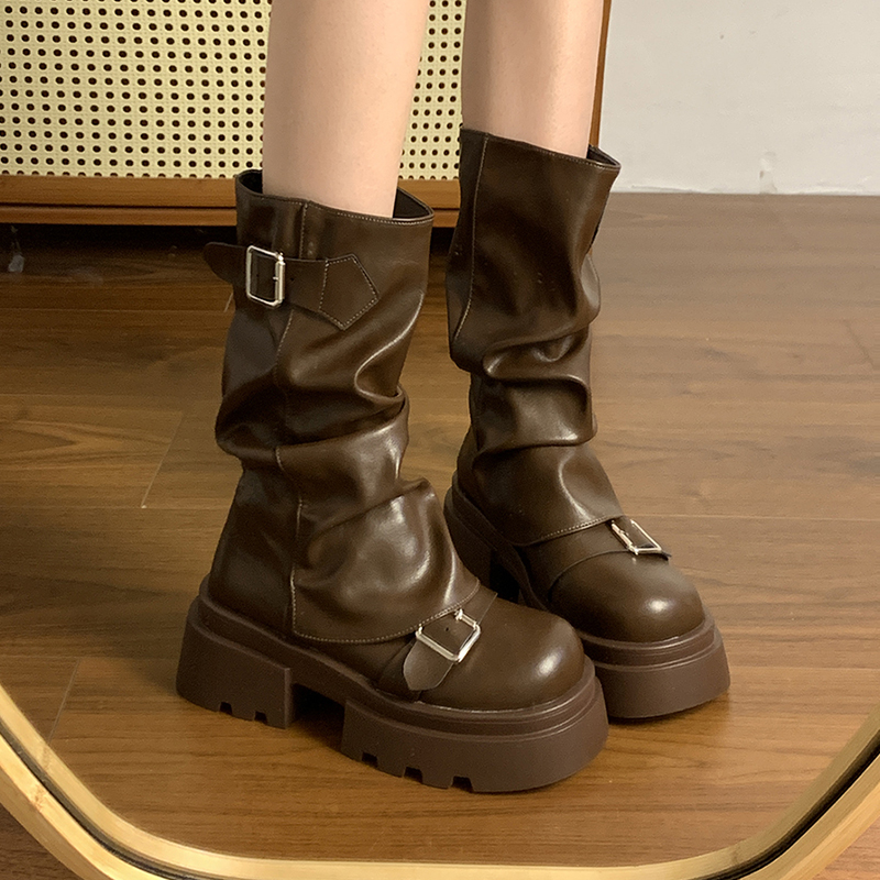 厚底增高马丁靴女2025新款春秋季复古棕色美拉德堆堆靴中筒裤管靴