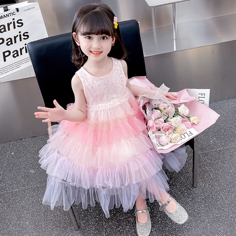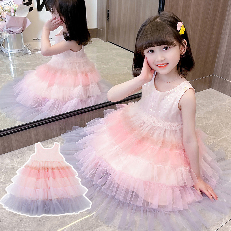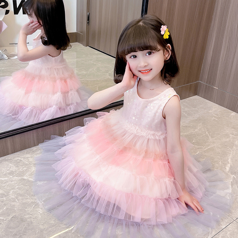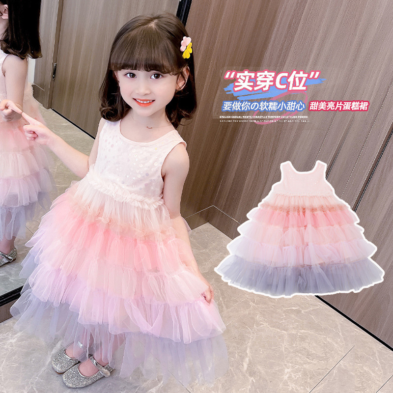 女童连衣裙夏季新款洋气儿童蛋糕裙女孩彩虹网纱背心裙公主裙