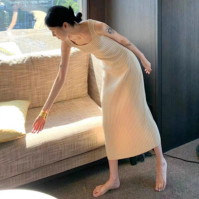 法式高级感杏色无袖内搭针织连衣裙女气质修身显瘦吊带背心长裙子