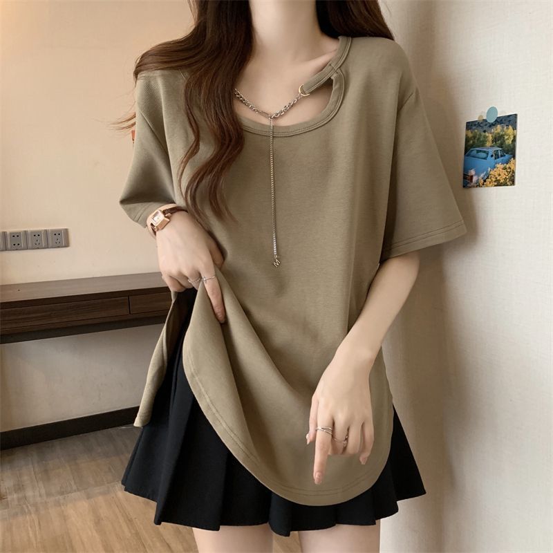 短袖T恤女夏季新款韩版宽松圆领百搭链条不规则小众上衣女ins