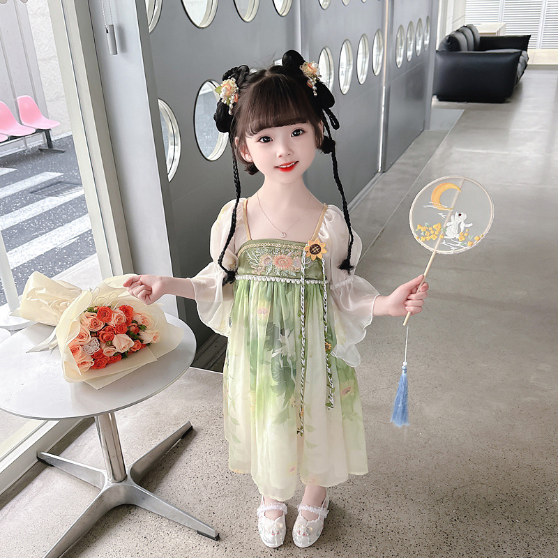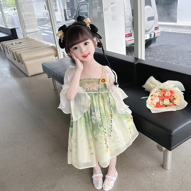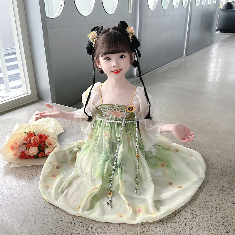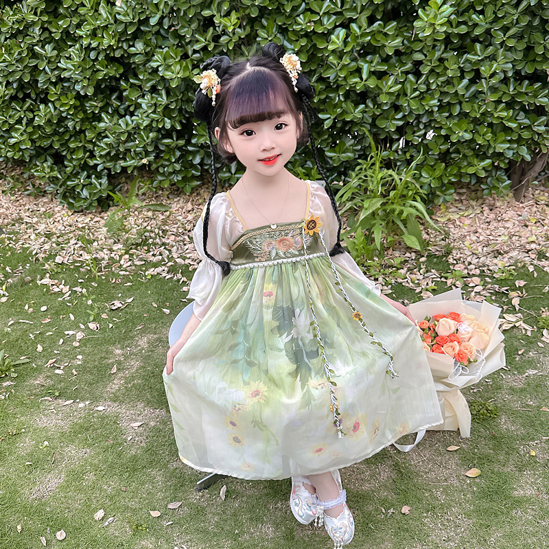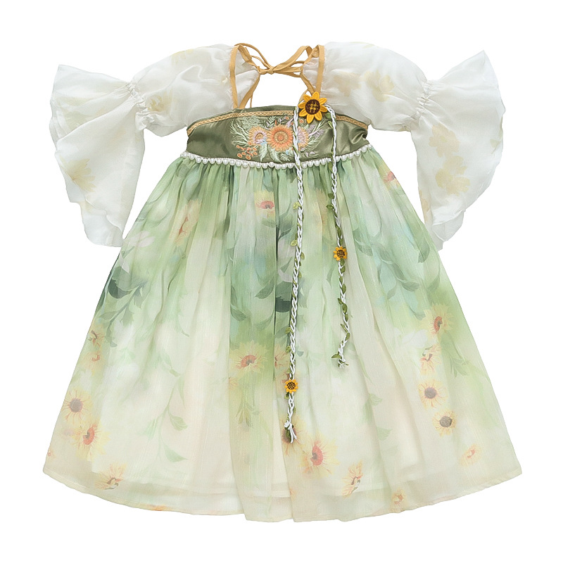 小女孩夏季新款中国风唐装古风汉服向日葵花裙连衣裙表演服