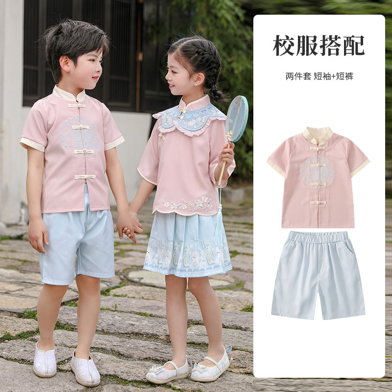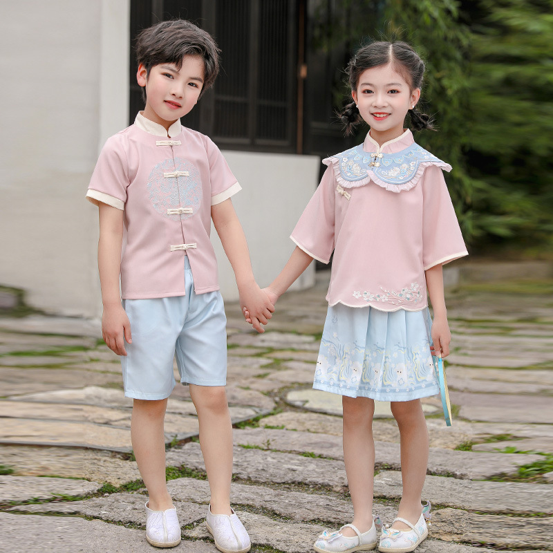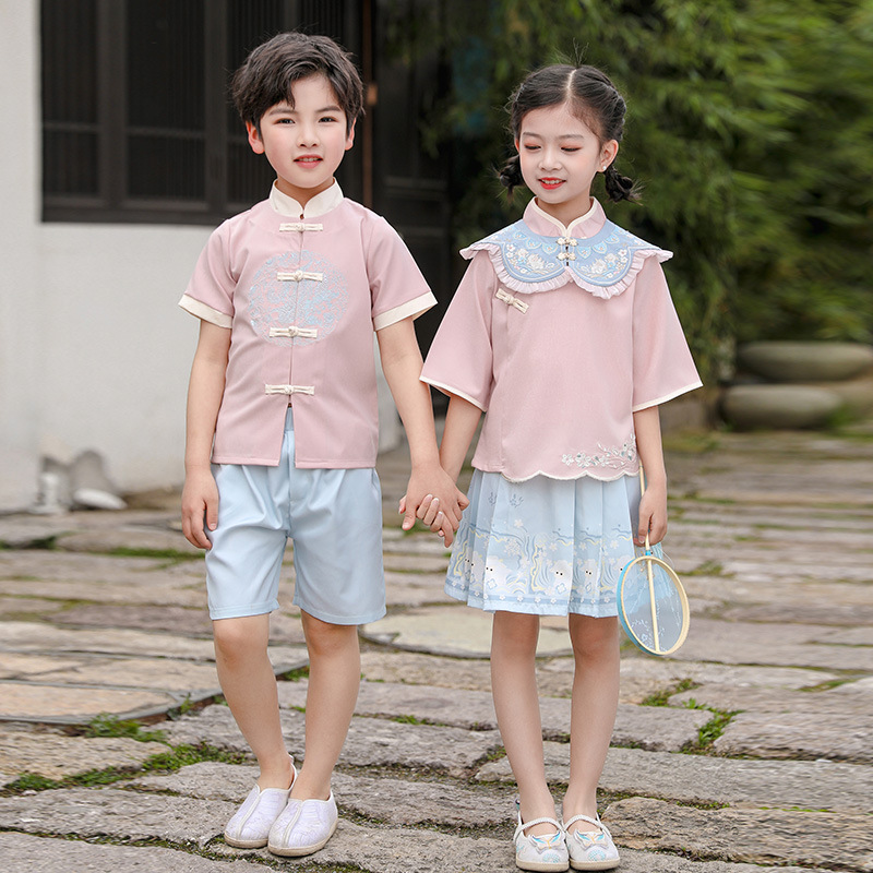 男女童汉服中国风夏季新品幼儿园演出服唐装姐弟古风装短袖表演服