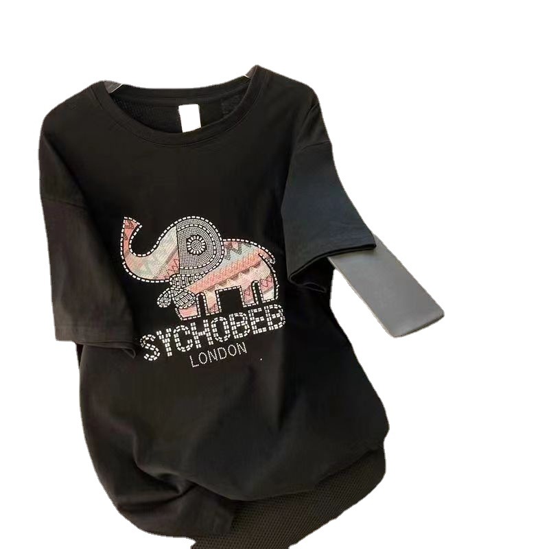 女装新款夏季宽松大码镶钻棉短袖t桖中长款白色韩版半袖