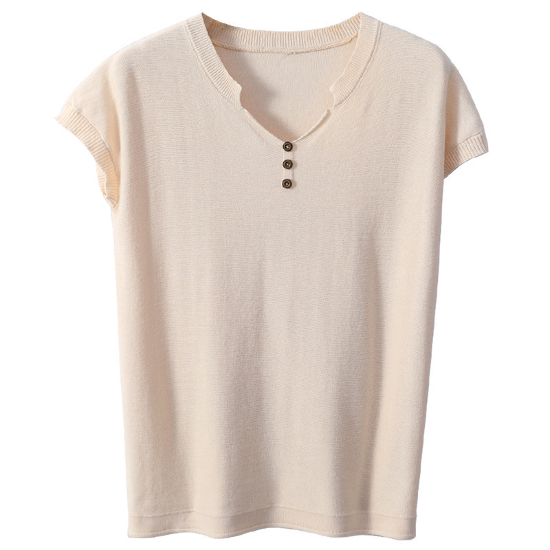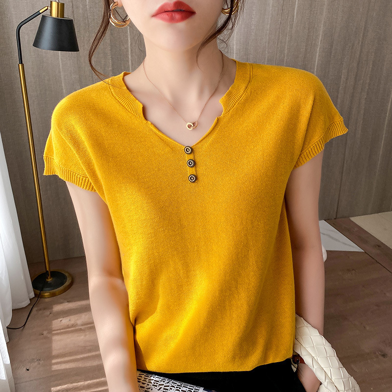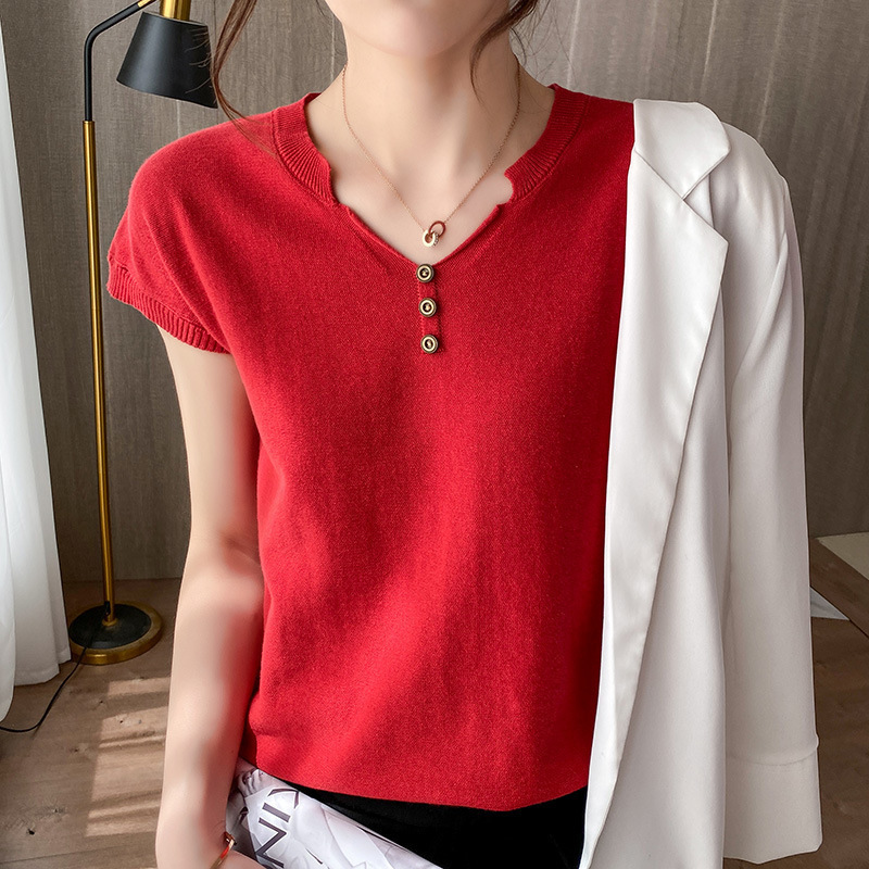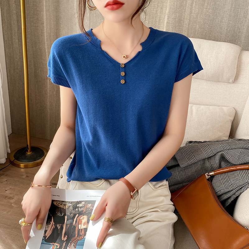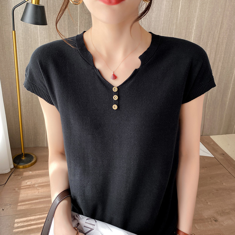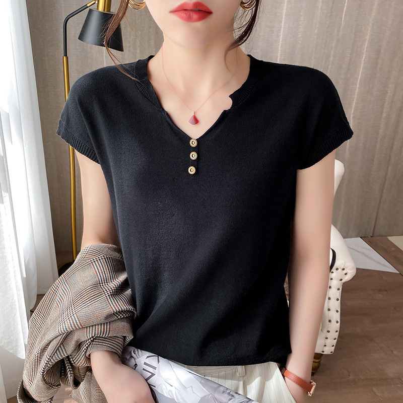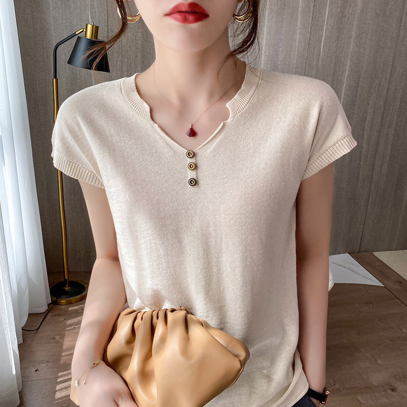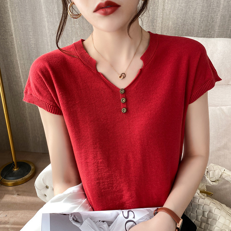 春夏季新款针织T恤衫女棉V领短袖宽松显瘦套头半袖棉上衣