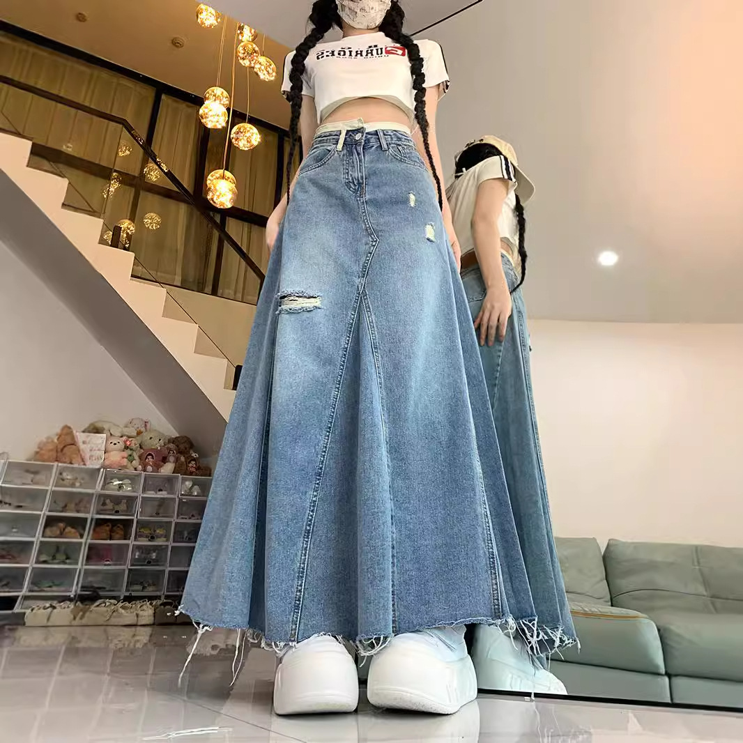 大码复古破洞牛仔半身裙女夏季胖mm高腰显瘦中长款a字包臀鱼尾裙
