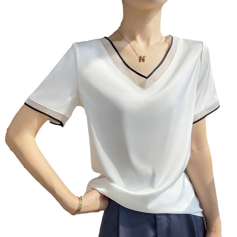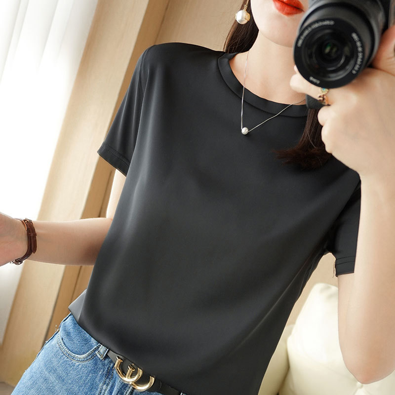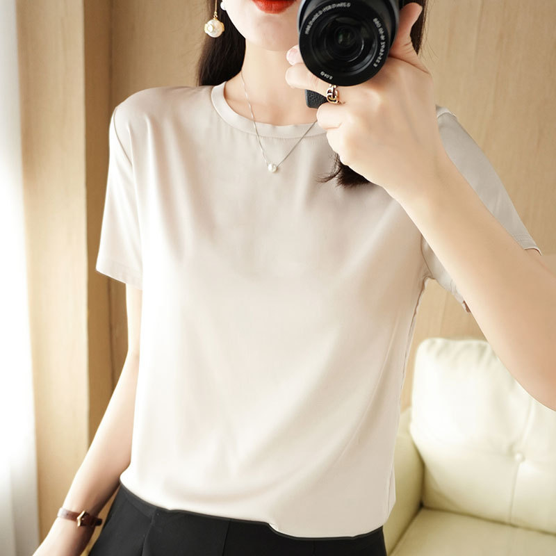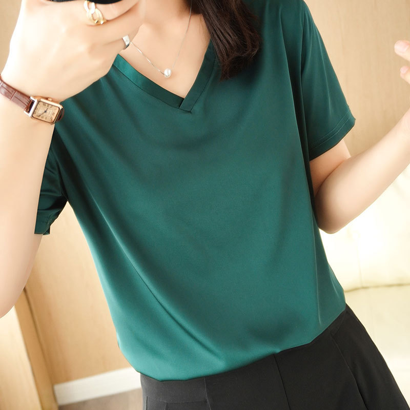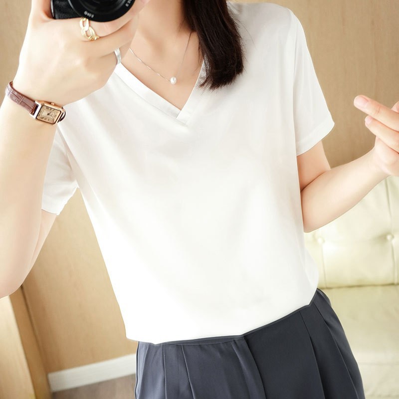 夏季冰丝棉缎面短袖女士新款休闲体恤高质感宽松女装V领打底t恤女