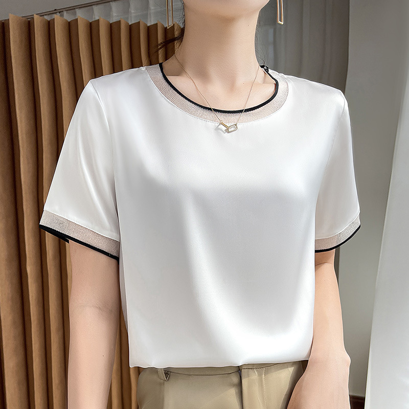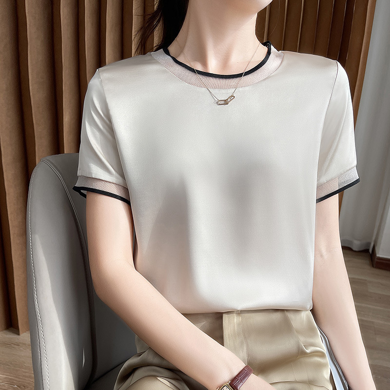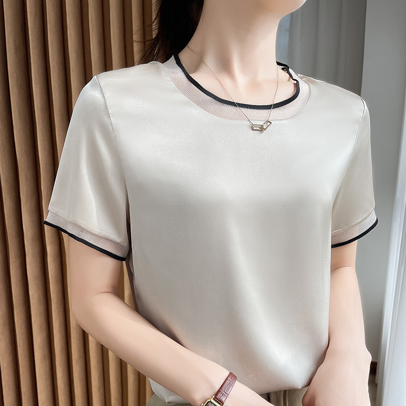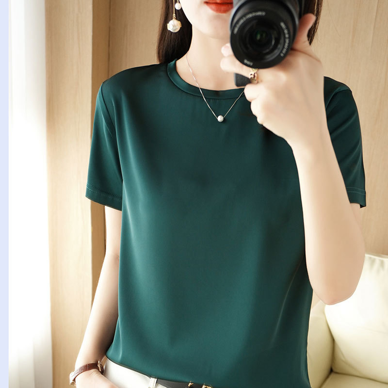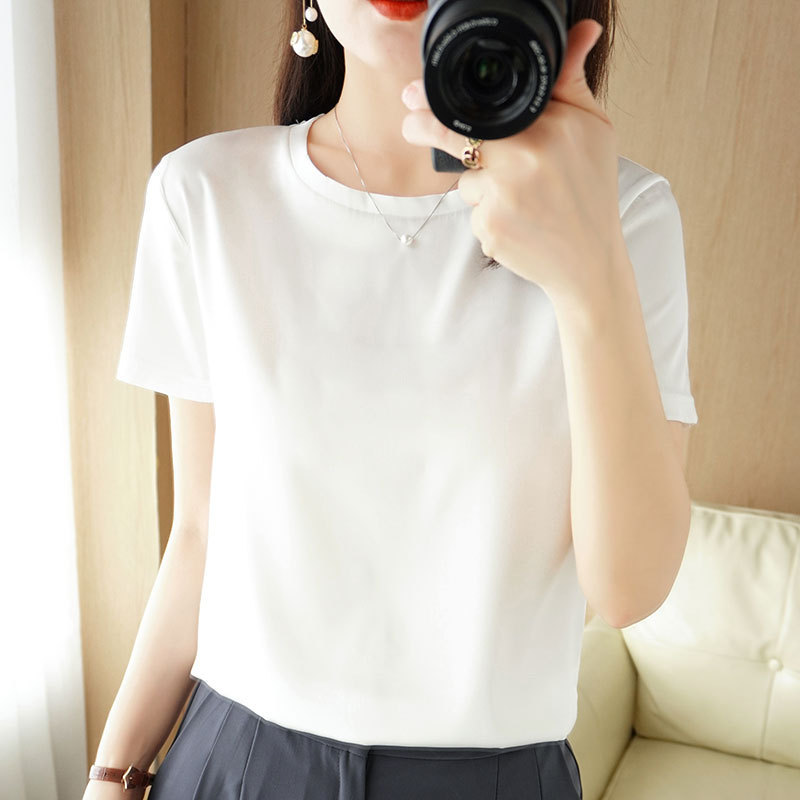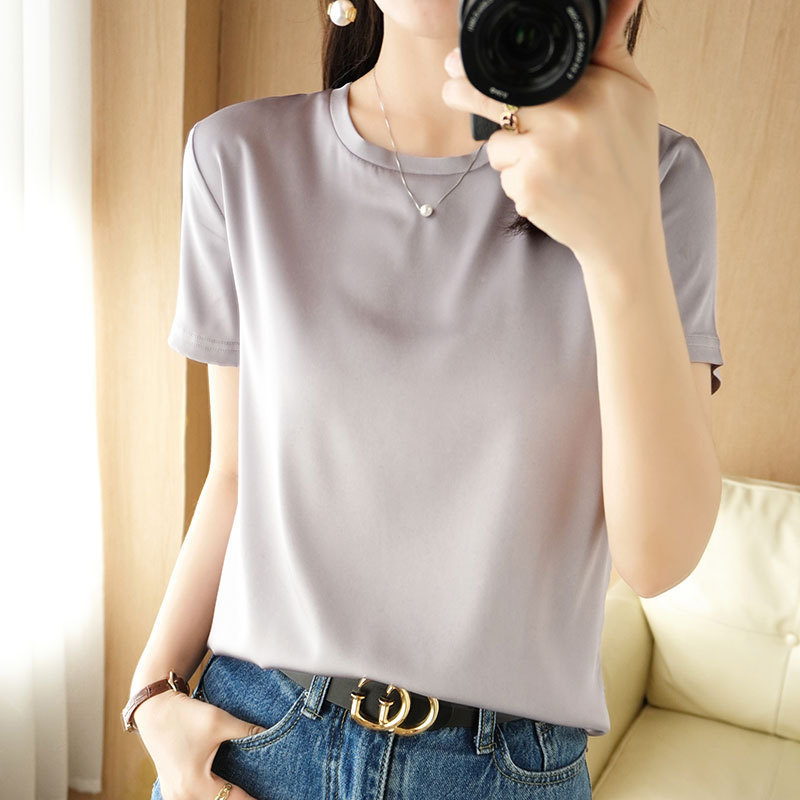 夏季冰丝棉缎面短袖女士新款休闲体恤高质感宽松女装V领打底t恤女